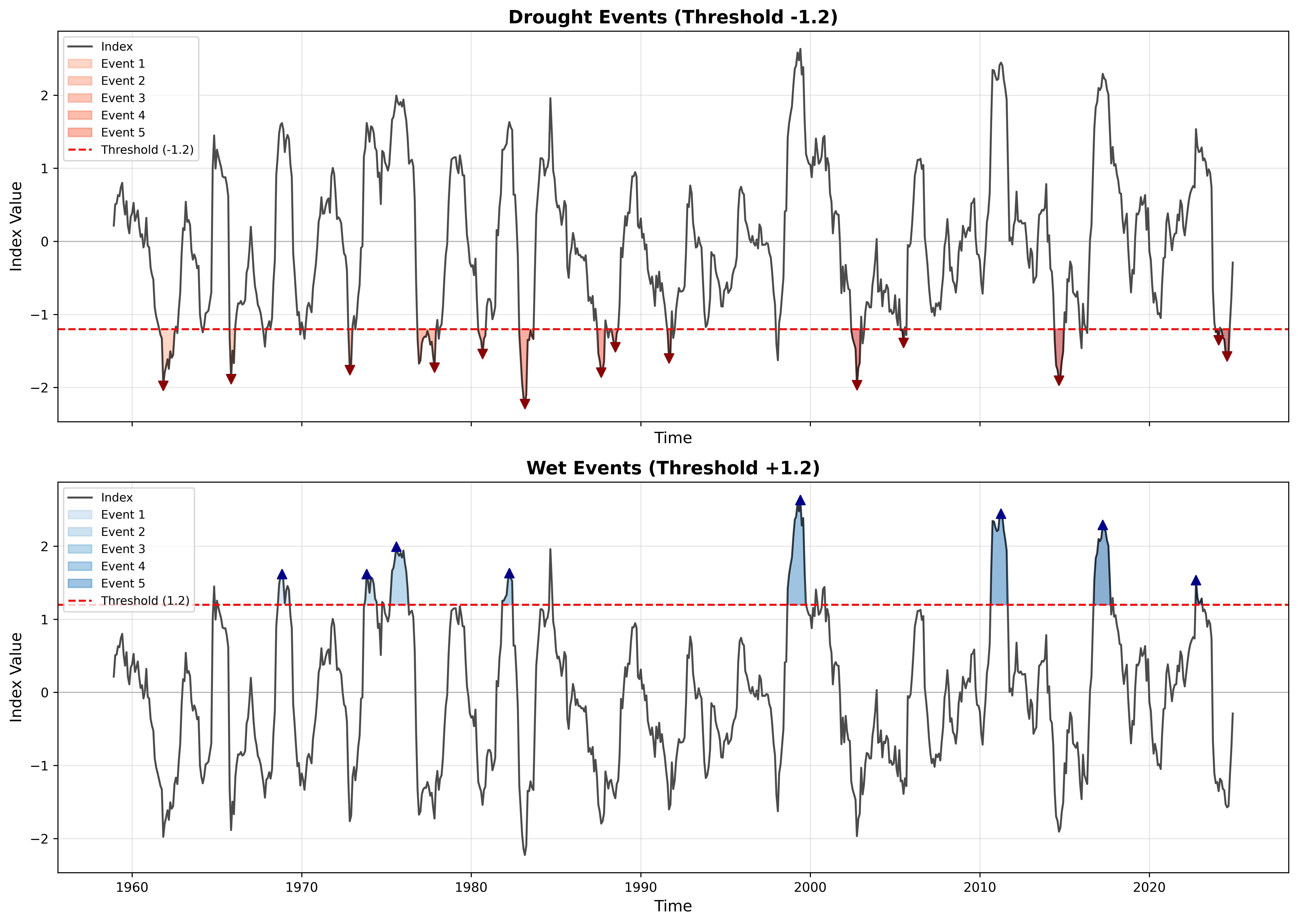 print(f"\nDrought events: {len(drought_events)} | Wet events: {len(wet_events)}")