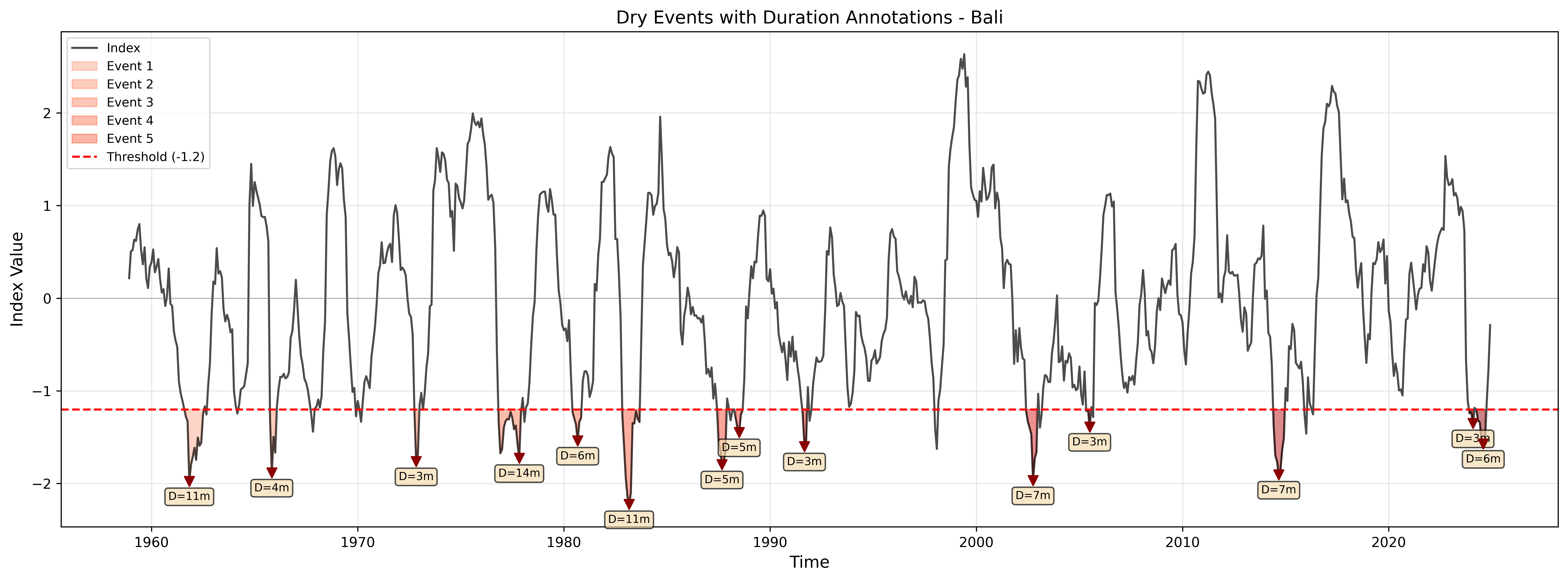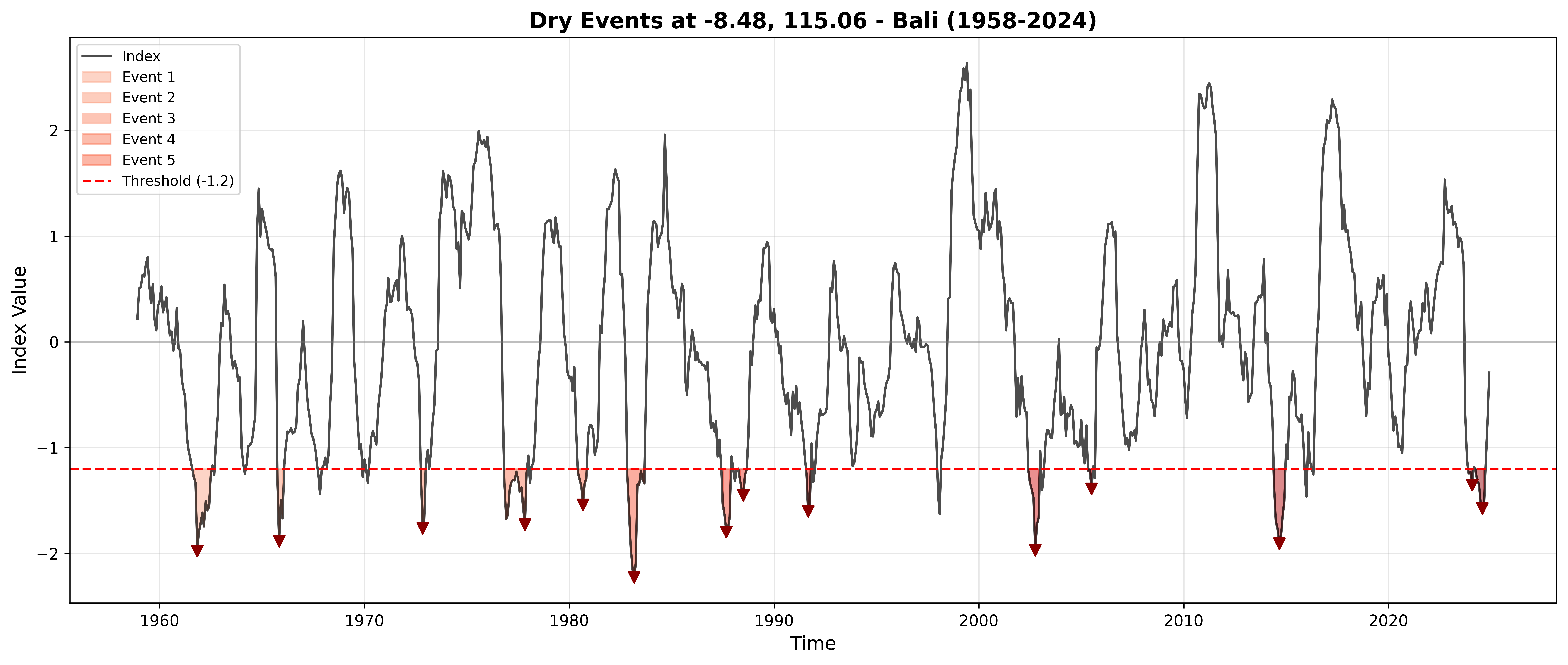 title=f'Dry Events Analysis - Bali, Indonesia ({lat_val:.2f}, {lon_val:.2f})')