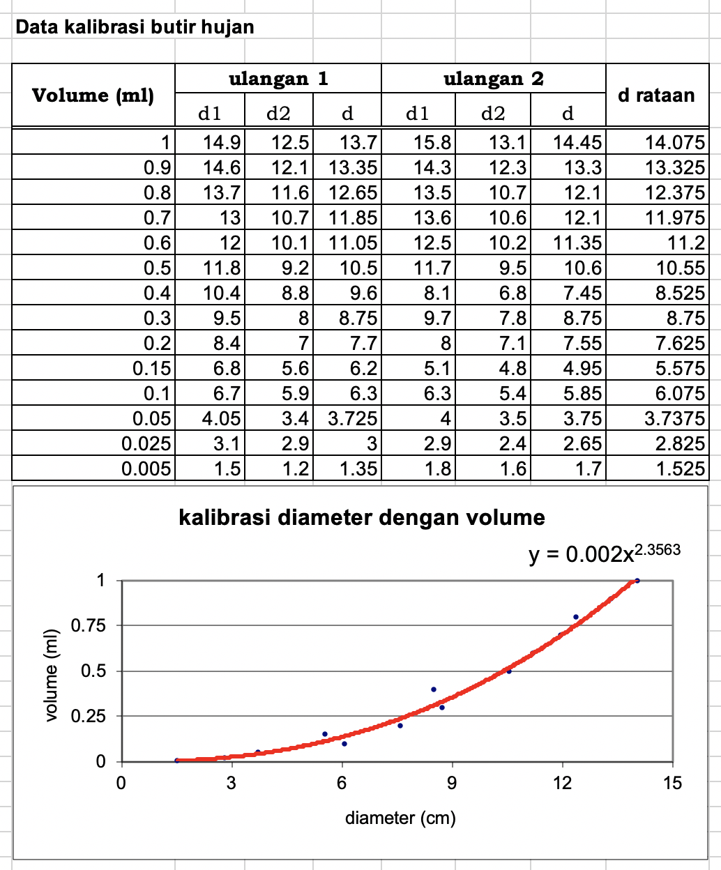 Selain itu bekerja dalam kelompok, kita harus melakukan kalibrasi butir hujan dalam berbagai ukuran milimeter dan dengan 2 kali ulangan kemudian dihitung diameter rataannya. Cukup menyenangkan tapi juga membosankan ketika harus mengukur butir satu-per-satu.