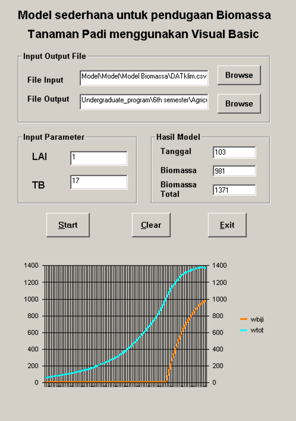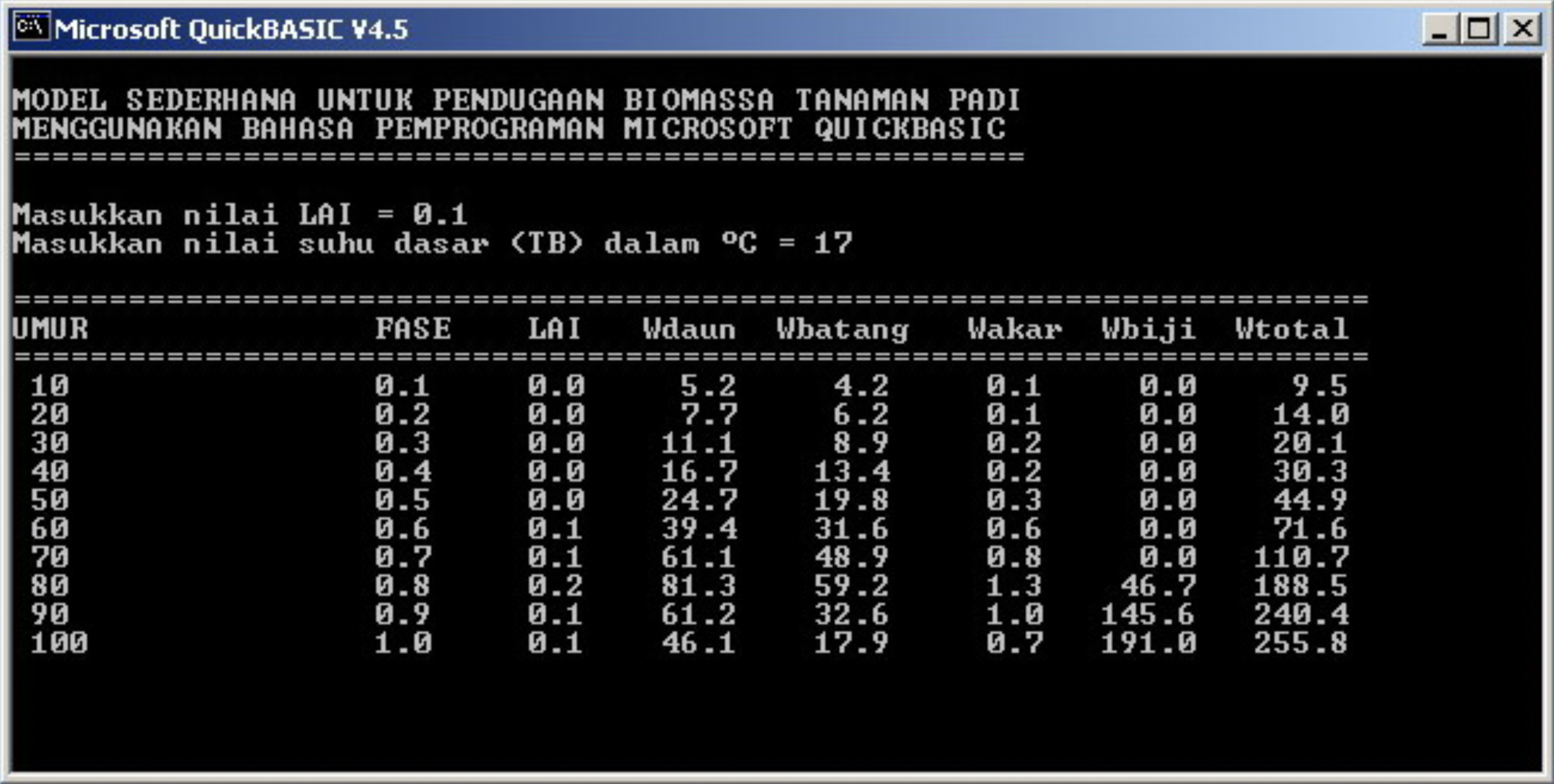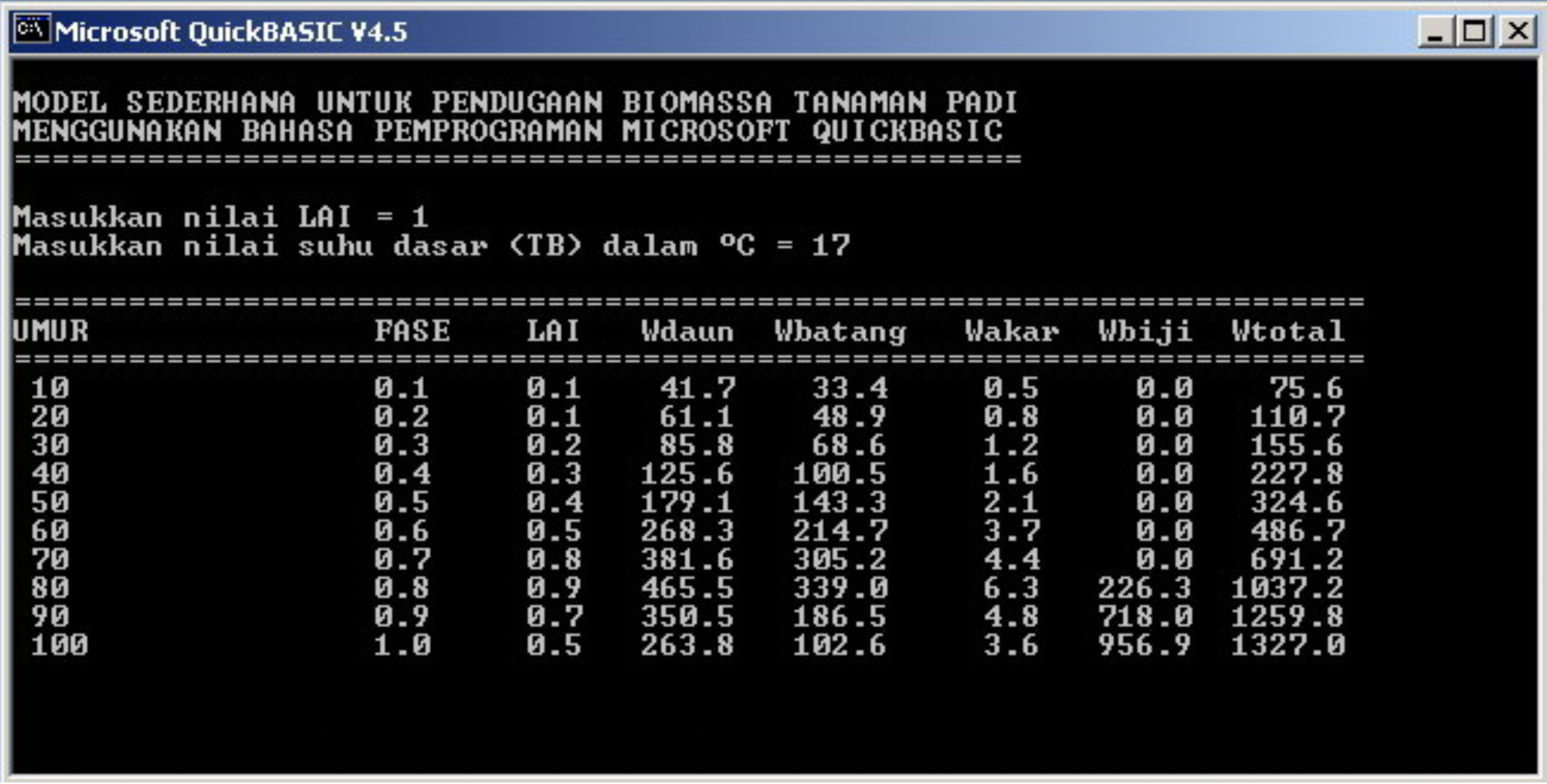 Selanjutnya paramater dan asumsi di atas ditulis menggunakan bahasa permograman BASIC. Model sederhana untuk pendugaan Biomassa Tanaman Padi berikut ini menggunakan parameter awal sebagai berikut: