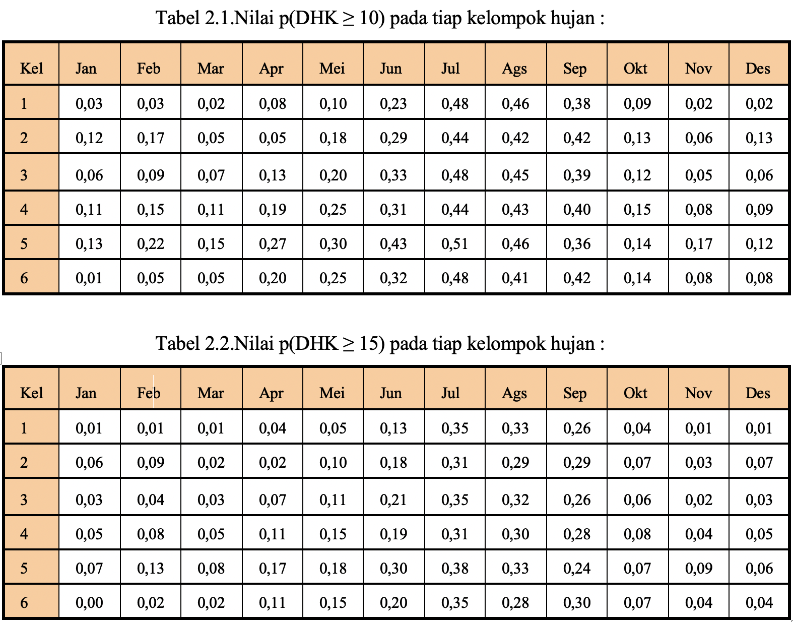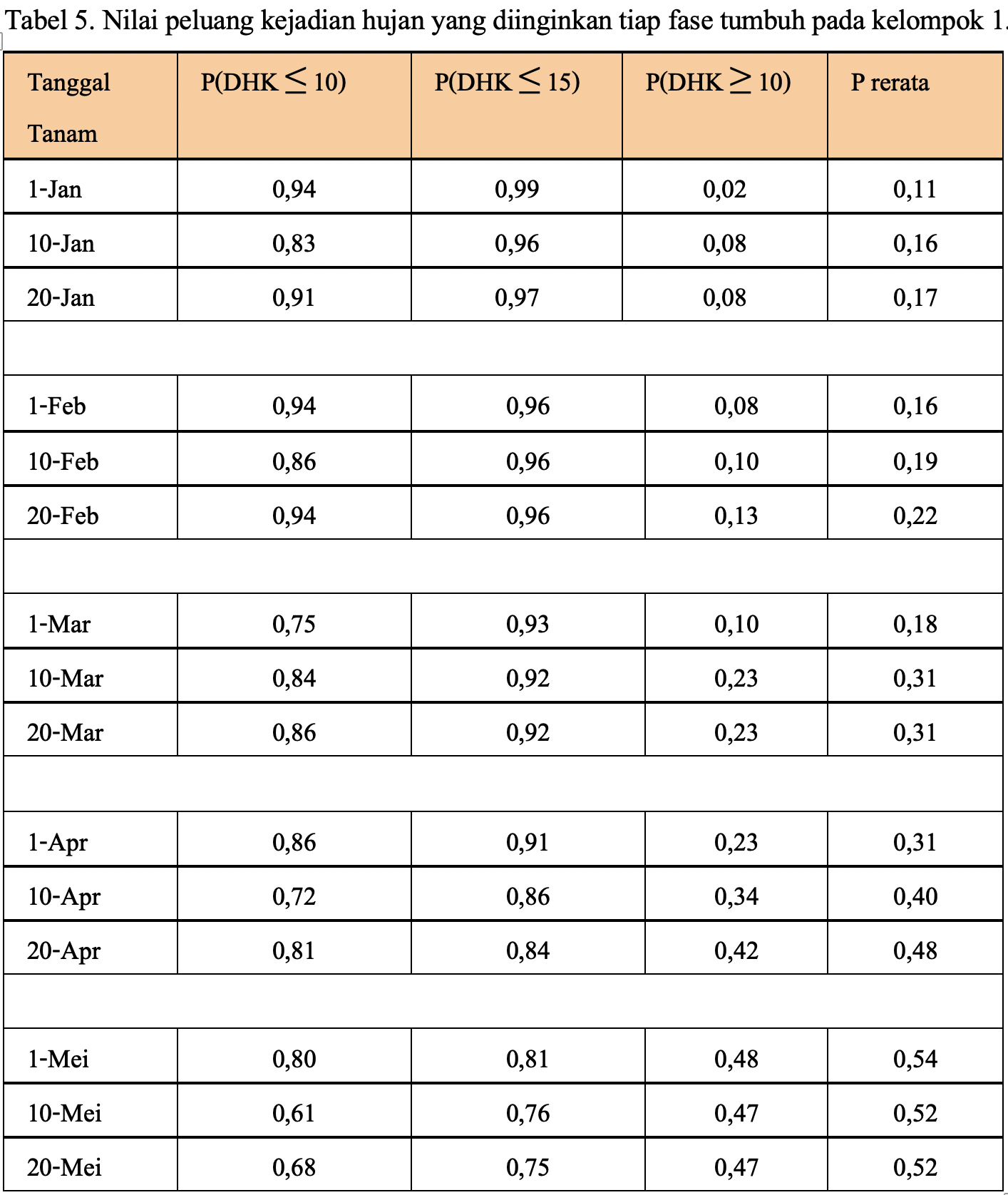 Dari hasil perhitungan tersebut, diambil contoh kelompok 1. Berdasarkan kondisi kejadian deret hari kering yang diinginkan oleh masing-masing fase tumbuh, maka nilai peluang dapat diperoleh (Tabel 5).