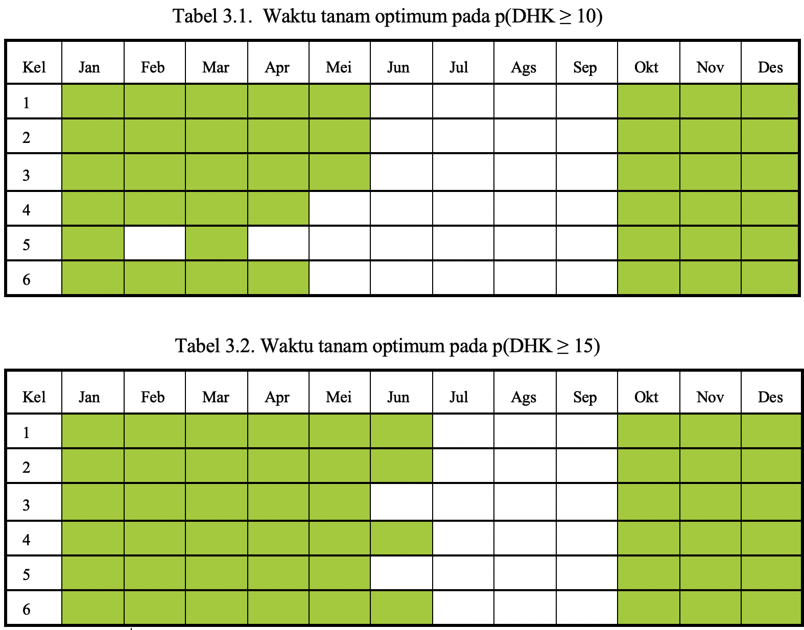 Catatan: Tabel yang diarsir menunjukkan waktu tanam optimum (peluang kekeringan tercapai ≤ 0,2)