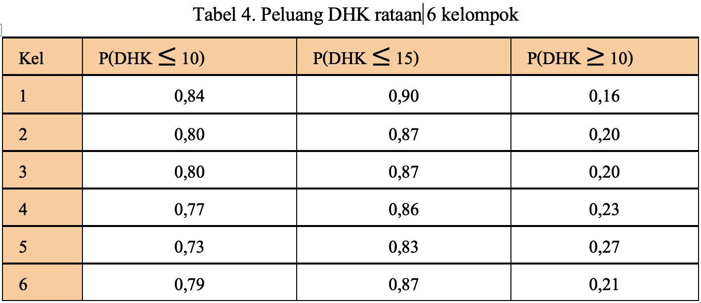 - Mencari nilai p(DHK ≥ 10) dan p(DHK ≥ 15) untuk masing-masing kelompok.