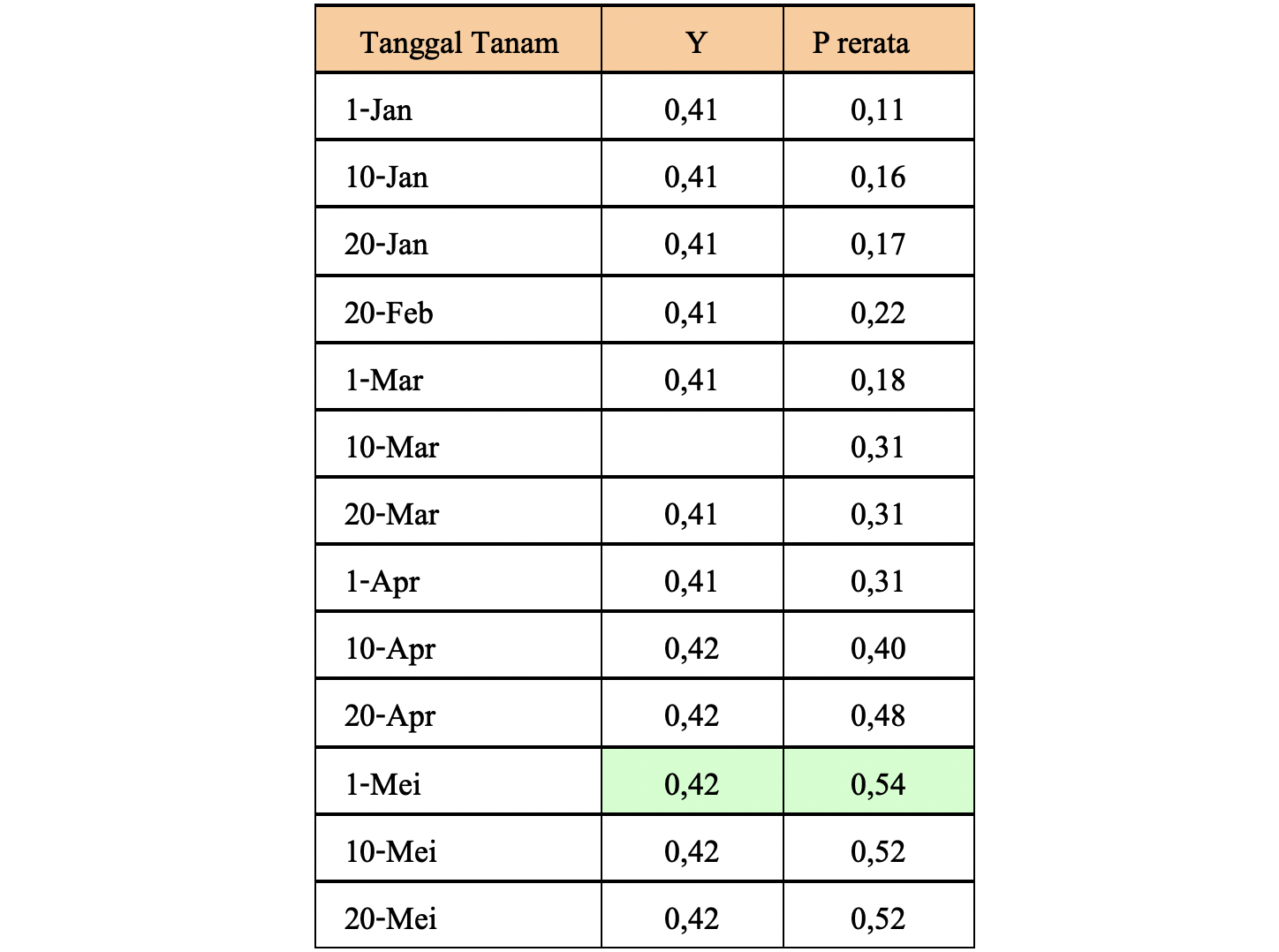 Dari perhitungan yang telah dilakukan nilai Y terbesar adalah 0,42. Pada saat Prerata maksimum, nilai Y juga 0,42 meskipun nilai Y tidak terlalu beragam. Mulai tanggal 10 April – 20 Mei waktu penananam, nilai Y = 0,42 tatapi nilai Prerata tanggal 1 Mei yang paling tinggi. Nilai peluang terjadinya deret hari kering ≥ 10 (X3) pada tanggal ini juga mempunyai nilai paling tinggi yaitu 0,48.