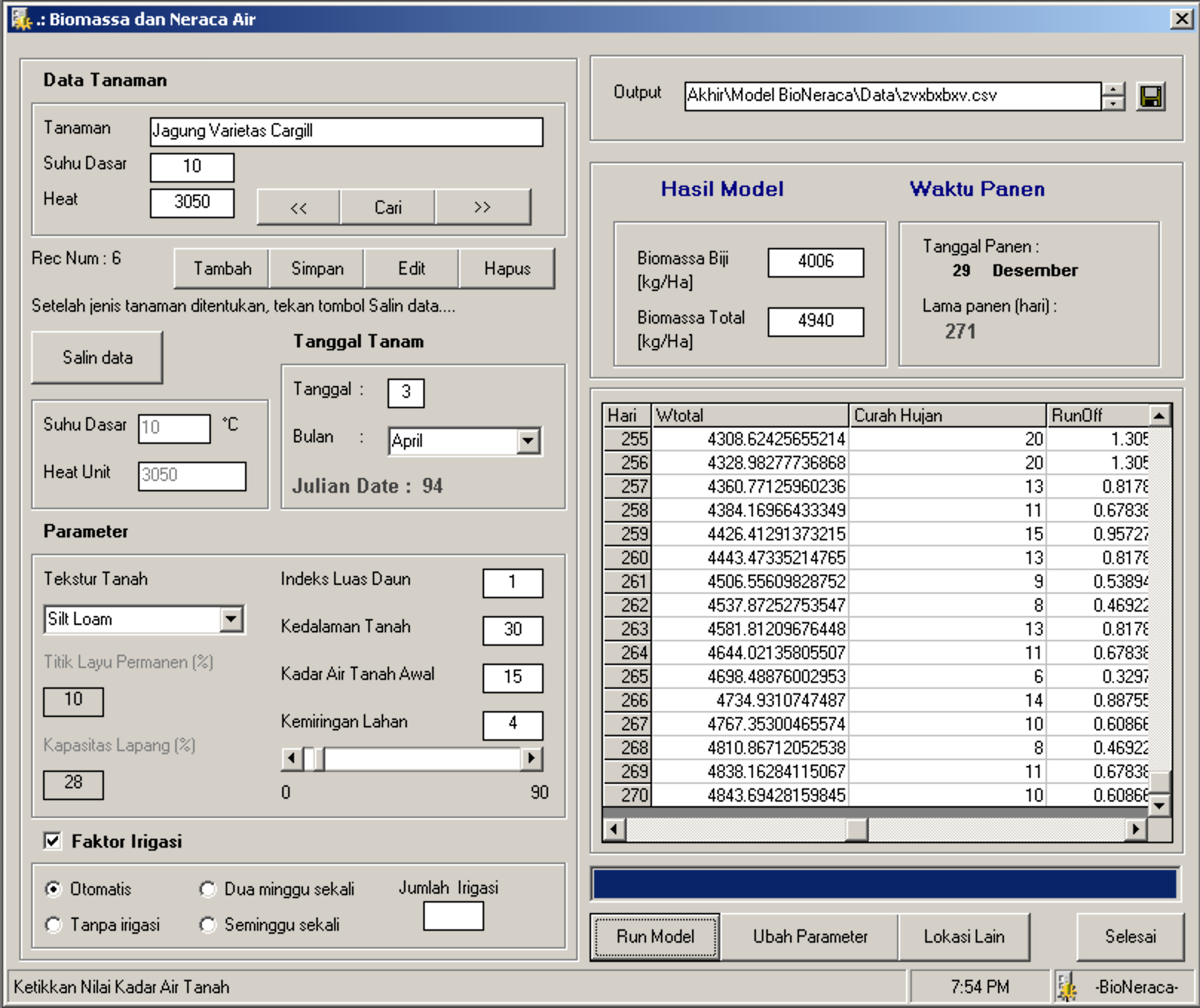 Model ini merupakan tugas akhir mata kuliah Model Simulasi Pertanian di Semester 6. Melanjutkan model sebelumnya yang telah diajarkan pada praktikum, kali ini saya menambahkan beberapa variable sehingga pengguna dapat: