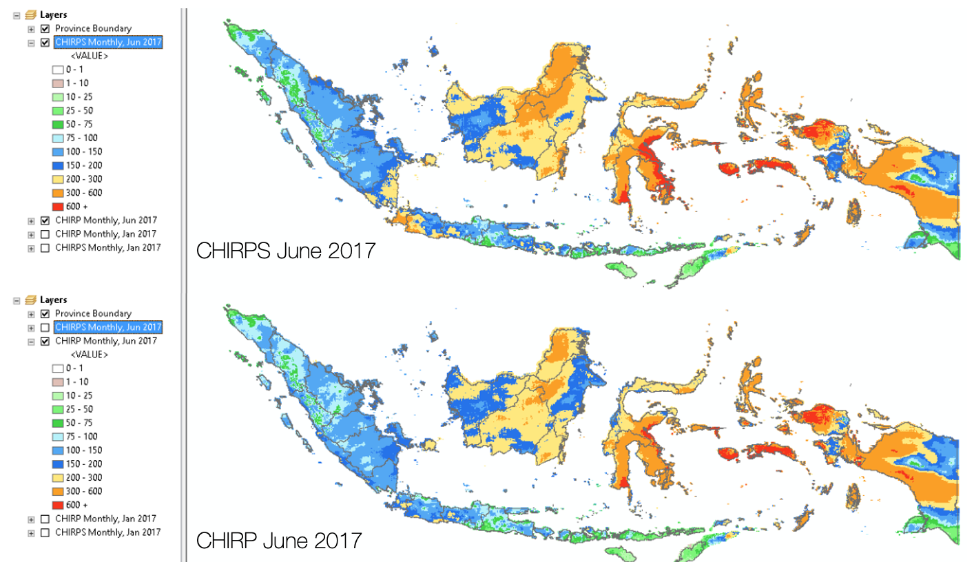 CHIRP and CHIRPS are gridded rainfall time series product from Climate Hazard Group of University California Santa Barbara, and the difference between the two data is CHIRPS incorporates station data. Let see comparison on below maps.