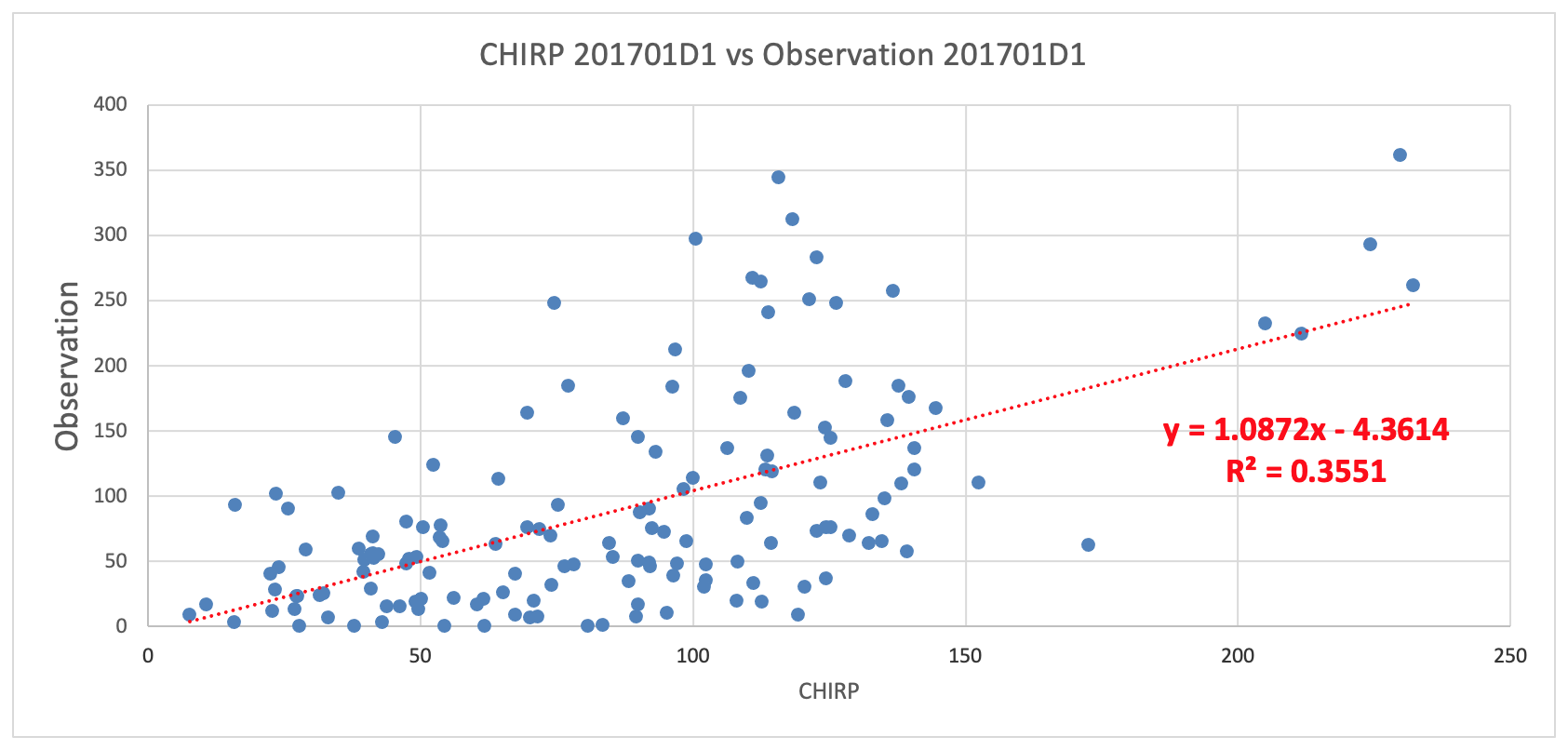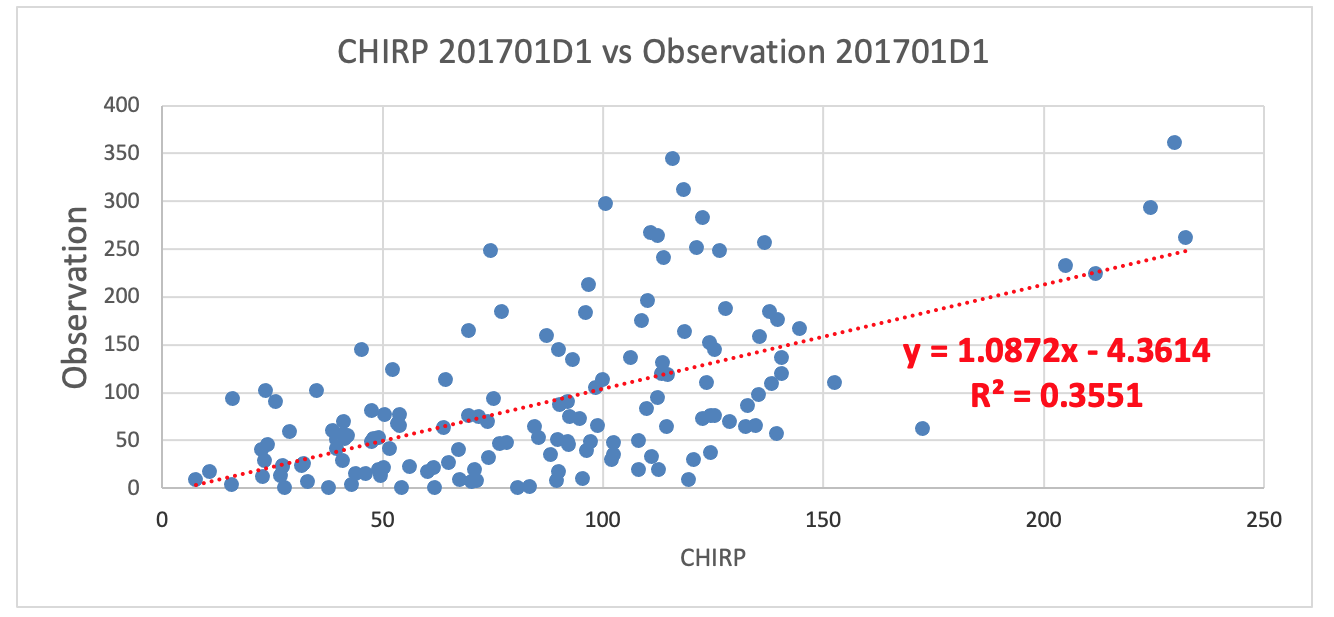 - Create scatter chart with observation data as Vertical axis and CHIRP data as Horizontal axis.