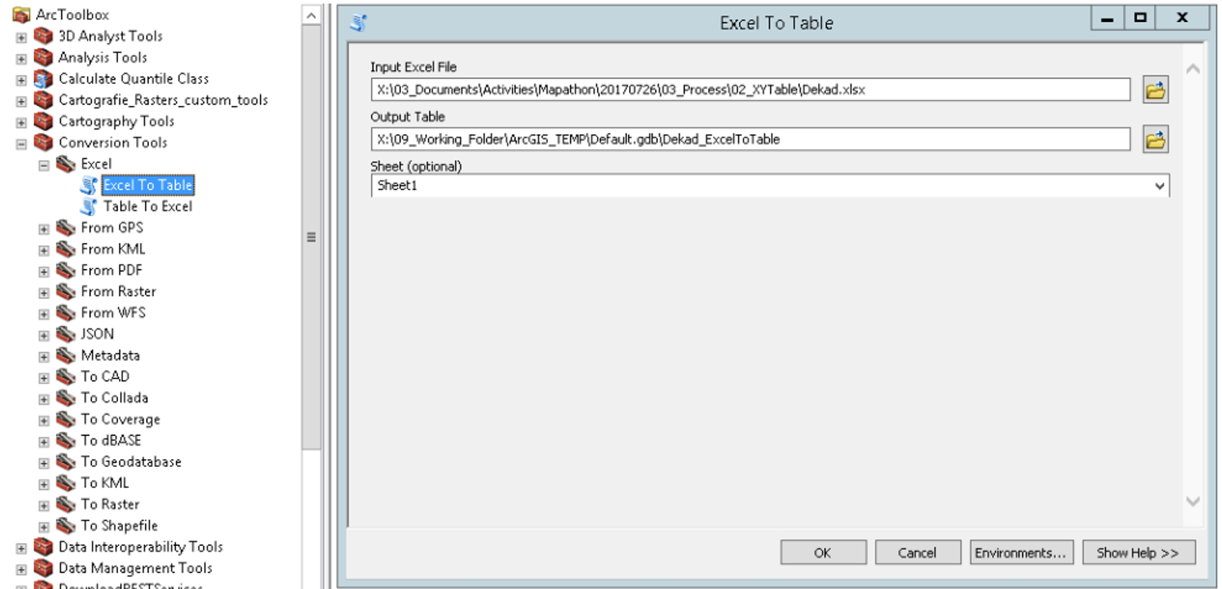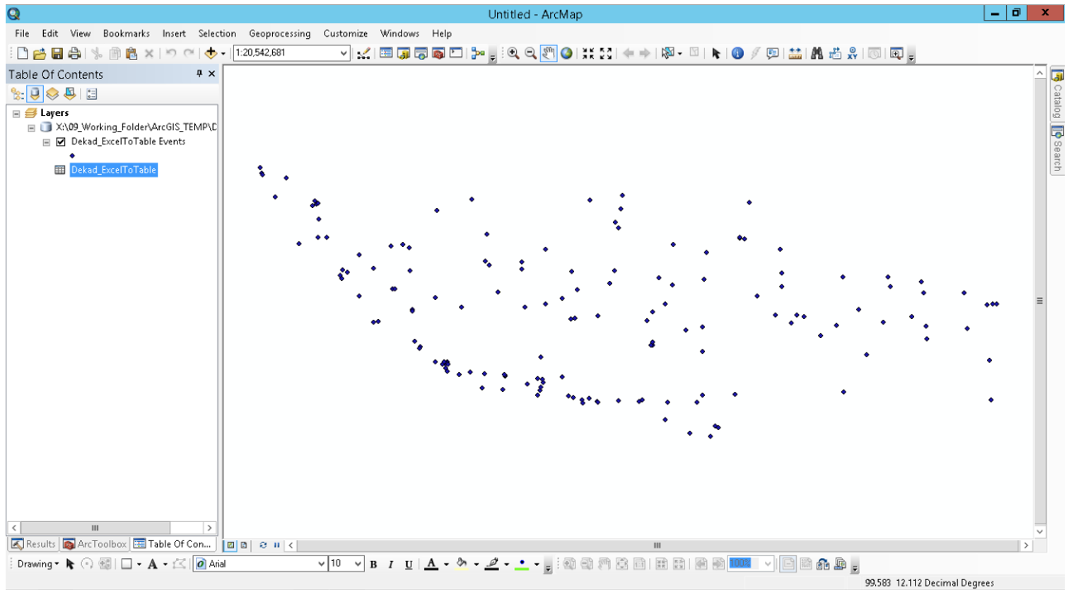 - Convert the new spreadsheet to table using ArcToolbox > Conversion Tools > Excel > Excel to Tables.
