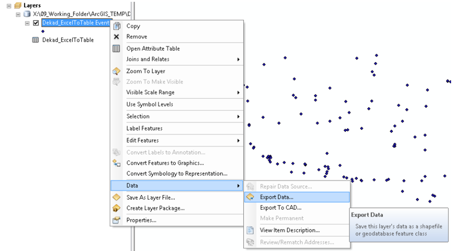 - Save the table events to shapefile. From Table of Content, right click the table events > Data > Export Data. Save as idn_cli_rpg_201701d1_bmkg_p.shp