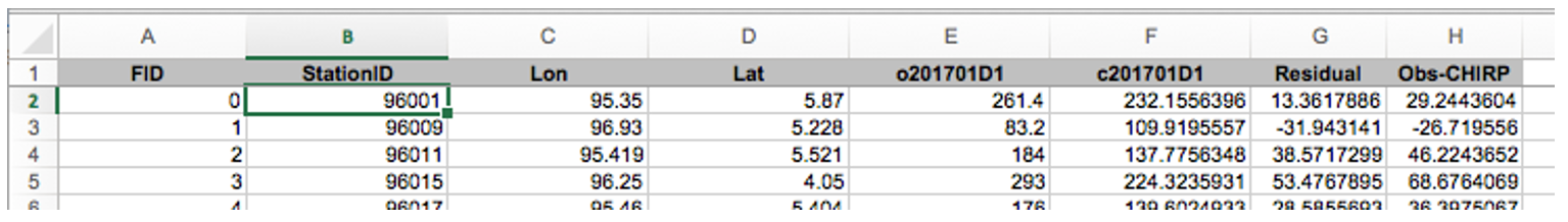 - Add a new column again, called “ObsMinRFE”. Calculate the difference between Observation and CHIRP data.