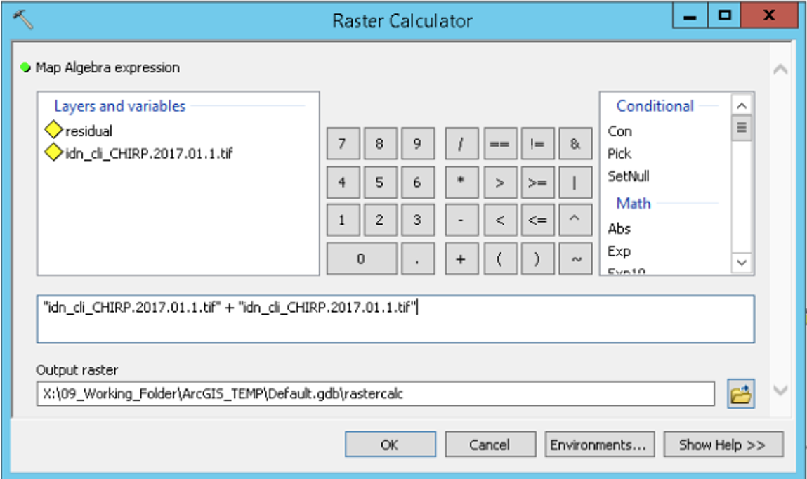 - There are two ways to do the calculation, using Plus tool from Spatial Analysts Tools > Math > Plus. And using Raster Calculator from Spatial Analysts Tools > Map Algebra > Raster Calculator.