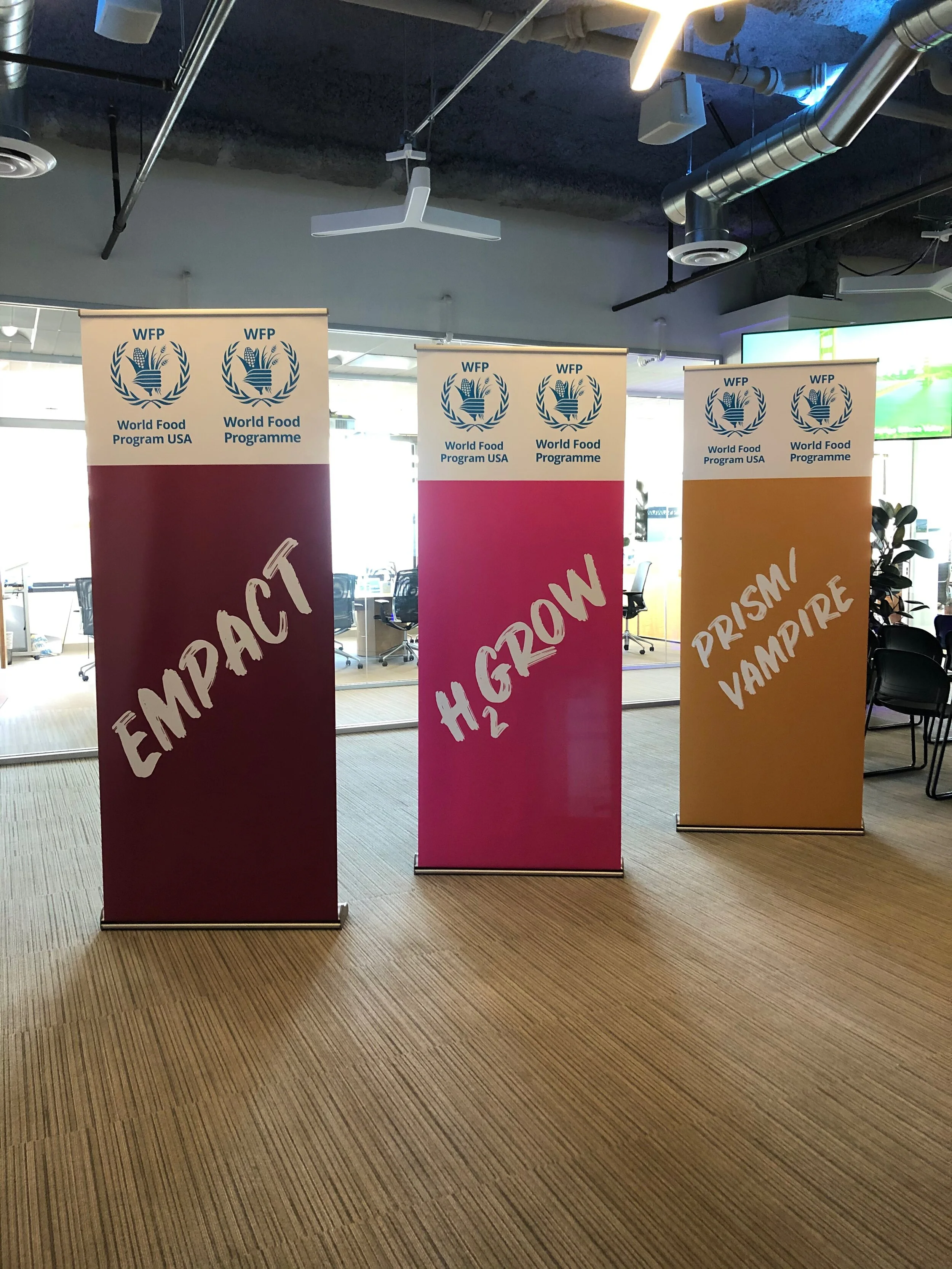 The Scale-Up teams represented innovations already being tested in WFP’s field operations, with the objective of scaling up their impact or reach. ShareTheMeal is an app which mobilizes microdonations to support WFP’s global operations; H2Grow is a hydroponic system that allows people to grow food with no soil and 90% less water; PLUS School Menus is software that calculates the most cost-effective menus that meet the nutritional requirements of children of different age groups; EMPACT is a digital skills training program that prepares refugee and war-affected youth for the future of work; and VAMPIRE/PRISM combines remote sensing data and population vulnerability information to produce risk and impact analytics.