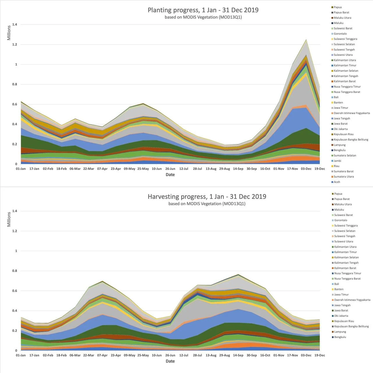 By analyzing MODIS satellite images over the growing season of 2019, total planted area for paddy was 11,3 million Ha and total harvested area was 11,4 million Ha. Please notice that planting area was calculated only for the period of 1 Jan - 31 Dec (excluding main planting season Oct - Dec from the earlier year).