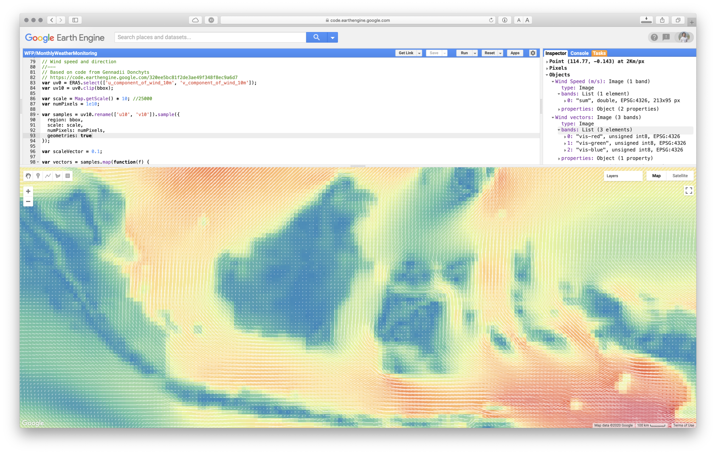 From Google Earth Engine Developer Groups, Gennadii Donchyts share his code on how to visualise wind vector. Lets adapt the code to use with ERA5 data.