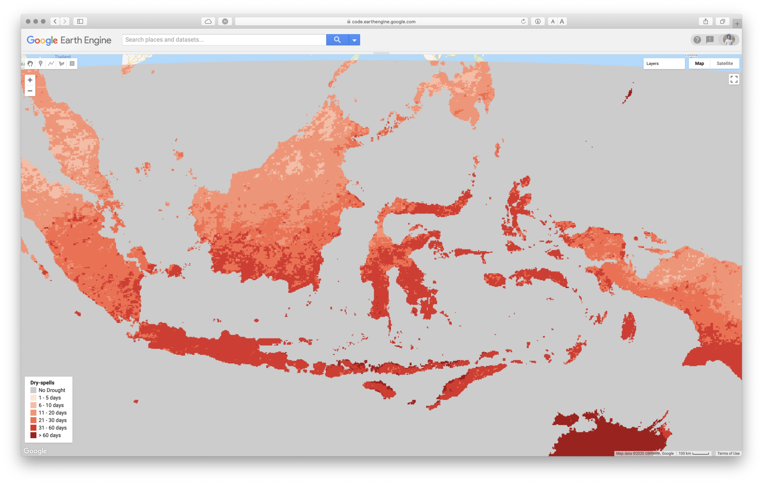 Now, it’s easy to get statistics information on AVERAGE, MINIMUM and MAXIMUM number of consecutive dry and wet days for a certain period using Google Earth Engine platform. Copy below code and paste into GEE.