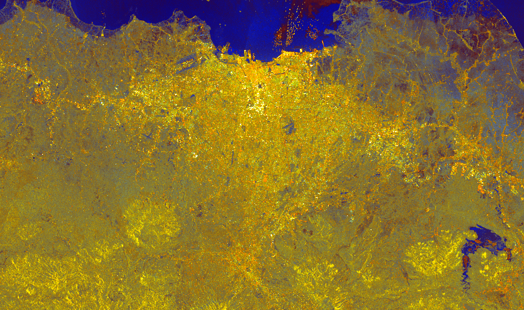 S1 backscatter, R co-pol (dB), G cross-pol (dB), Blue ratio.