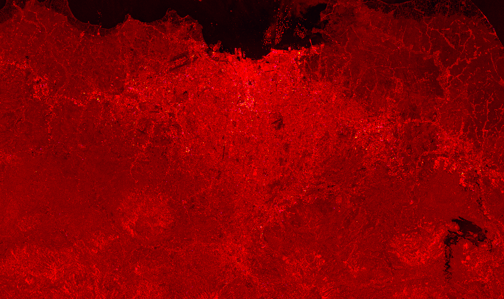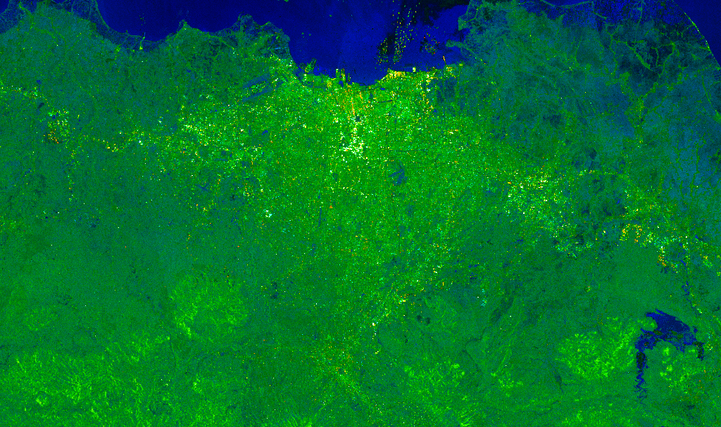 By using ImageMagick (free and open-source cross-platform software suite for displaying, creating, converting, modifying, and editing raster images), to get something that looks like land looks, we need to increase both brightness and contrast. Most well-known method is the -sigmoidal-contrast flag for convert, which takes a two-part argument: a scale factor for the contrast, plus the brightness value in the input image that should end up at 50% (midtone) in the output image. We can take the haze into account by lowering the blue channel’s gamma (brightness) slightly, and raising the red channel’s even less, before increasing the contrast. This gives us something that’s green where it should be green.