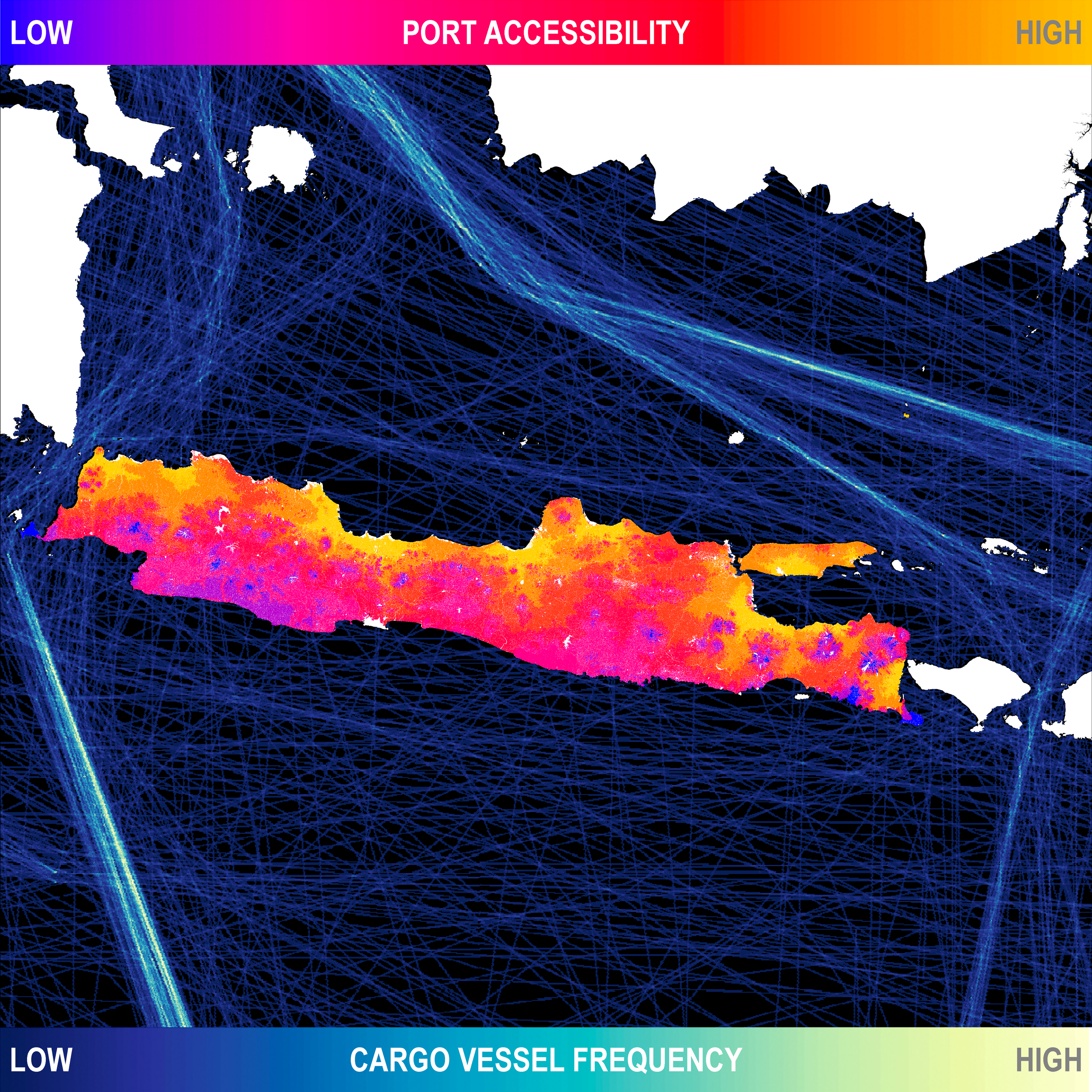 Port accessibility, measured travel time (mixed transportation mode) to the nearest public port (operated by govt: Pelindo or Kemenhub). Cargo vessel frequency, recorded thousands of commercial ships that moved across the ocean in 2012