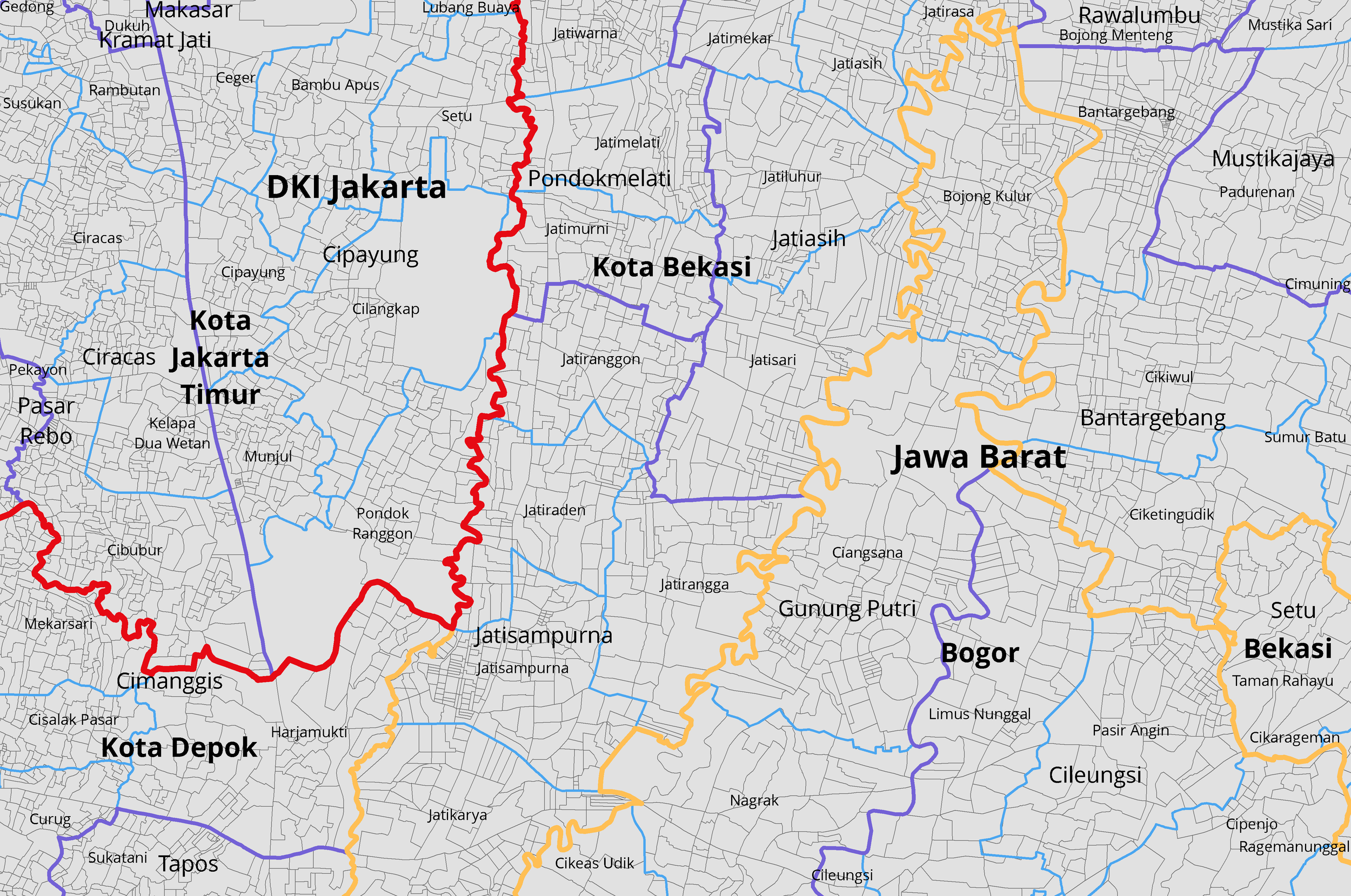 Administrative boundaries; red: admin1, orange: admin2, purple: admin3, blue: admin4; grey: admin5.