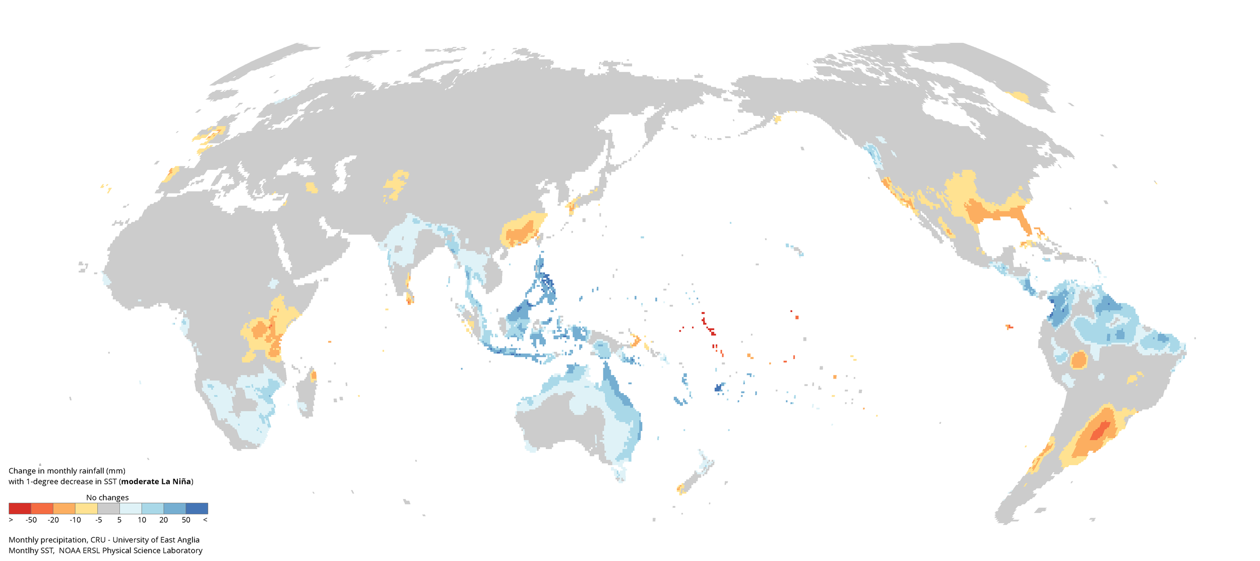 General sensitivity of rainfall in Indonesia to sea surface temperature (SST) changes in NINO-4 region (Strength of La Niña signal)
