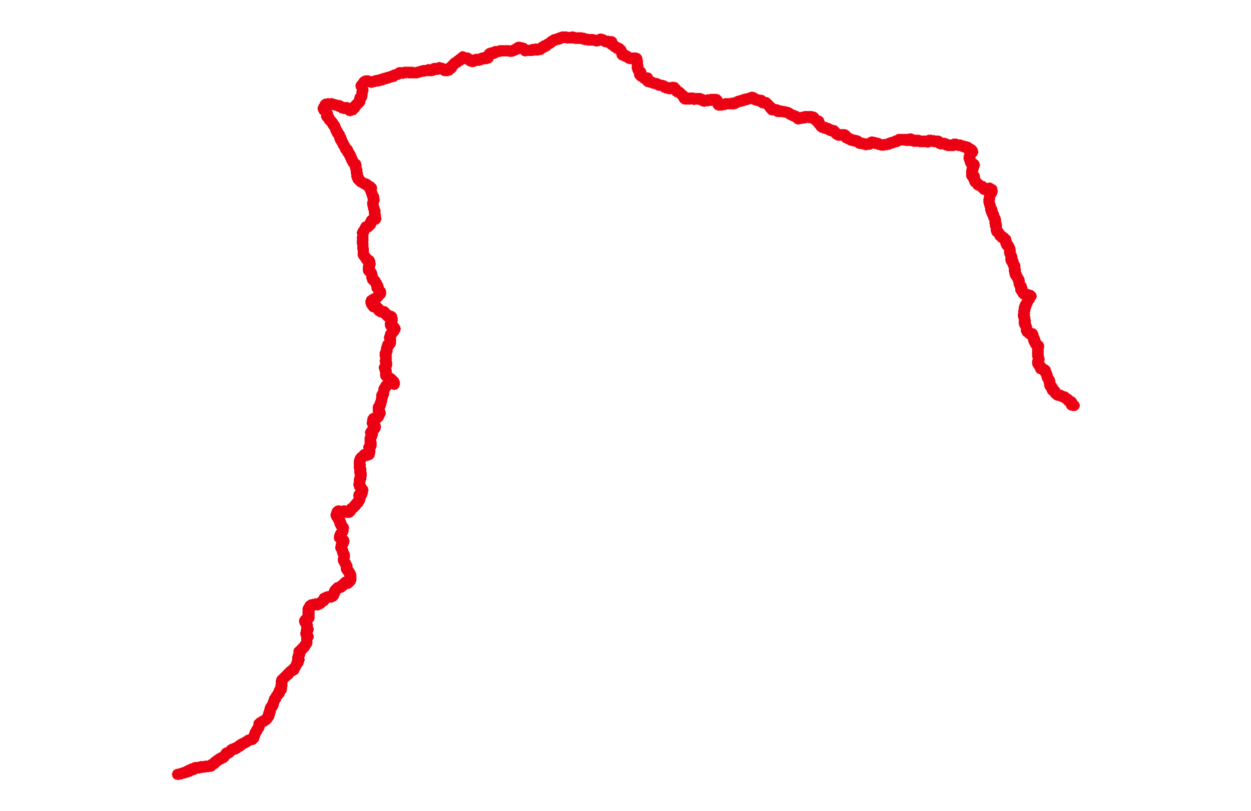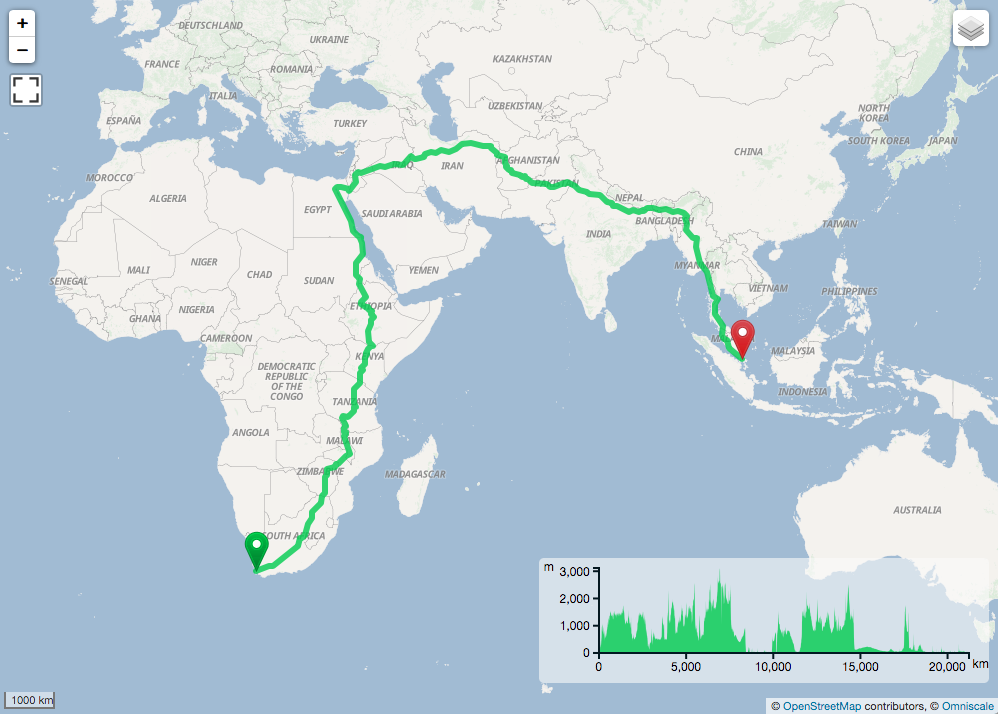 The below lines is actually a ~21,237 km car route from Cape Town, South Africa to Singapore on a world scale.