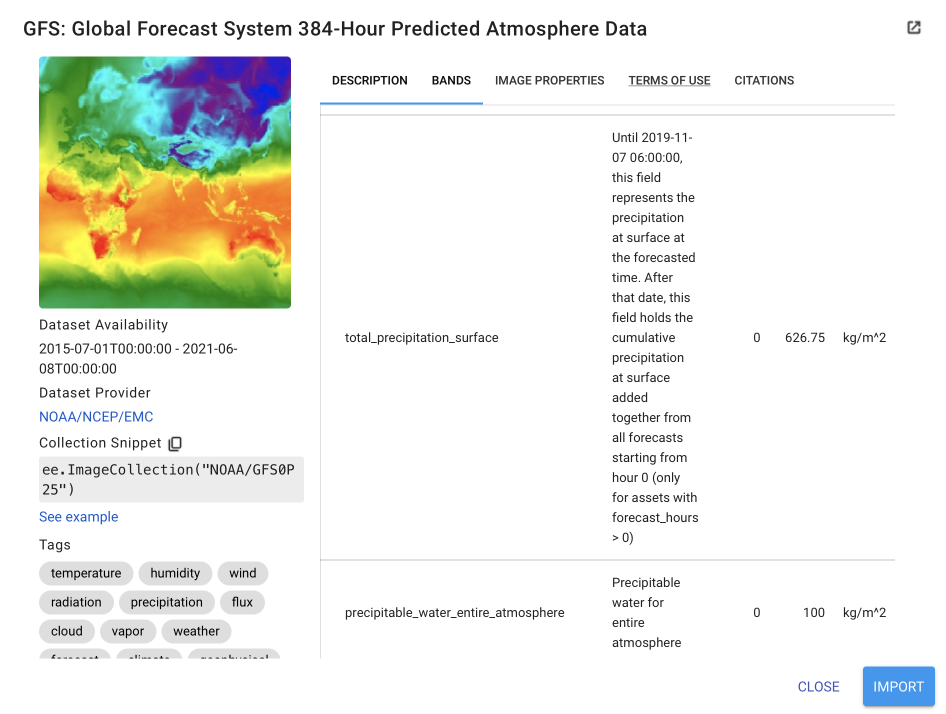 GFS data description in GEE available in this link: https://developers.google.com/earth-engine/datasets/catalog/NOAA_GFS0P25