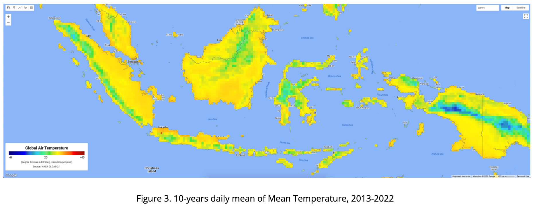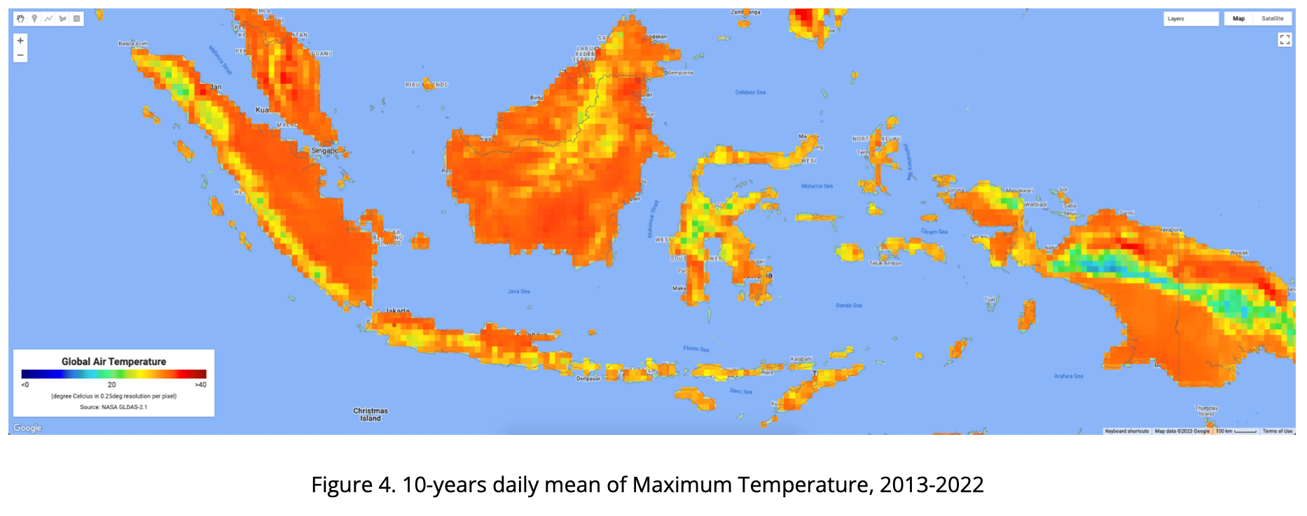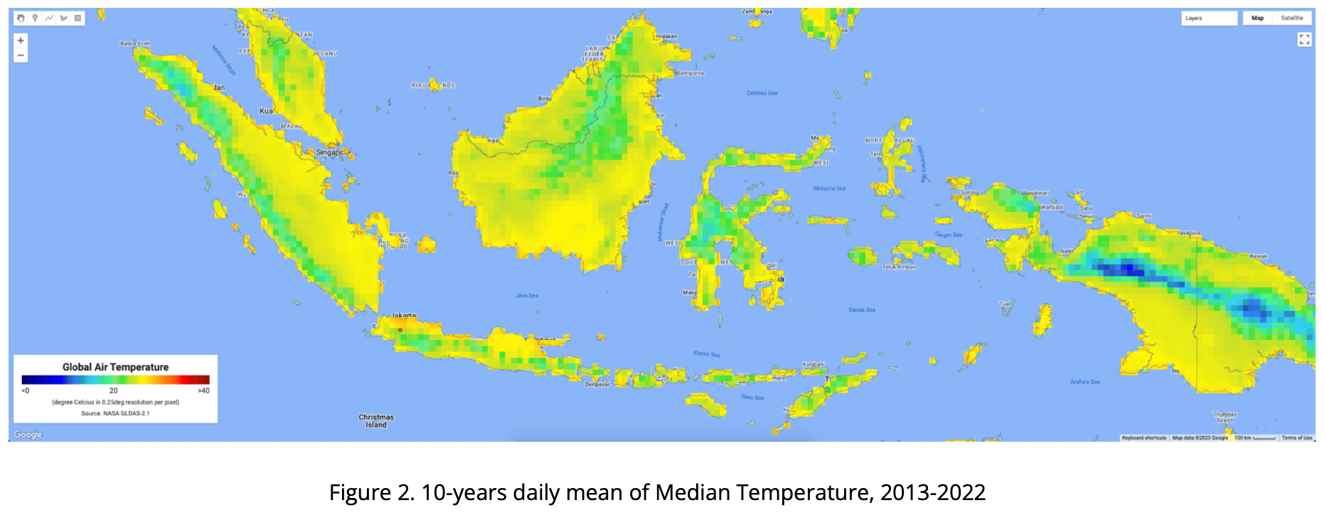 The four maps below consist of the 10-years daily mean of air temperature in Indonesia from 2013-2022, presented as Minimum, Median, Mean and Maximum Temperature. Visualizing using rainbow color, ranging from 0 - 40 degC, from dark blue to dark red.