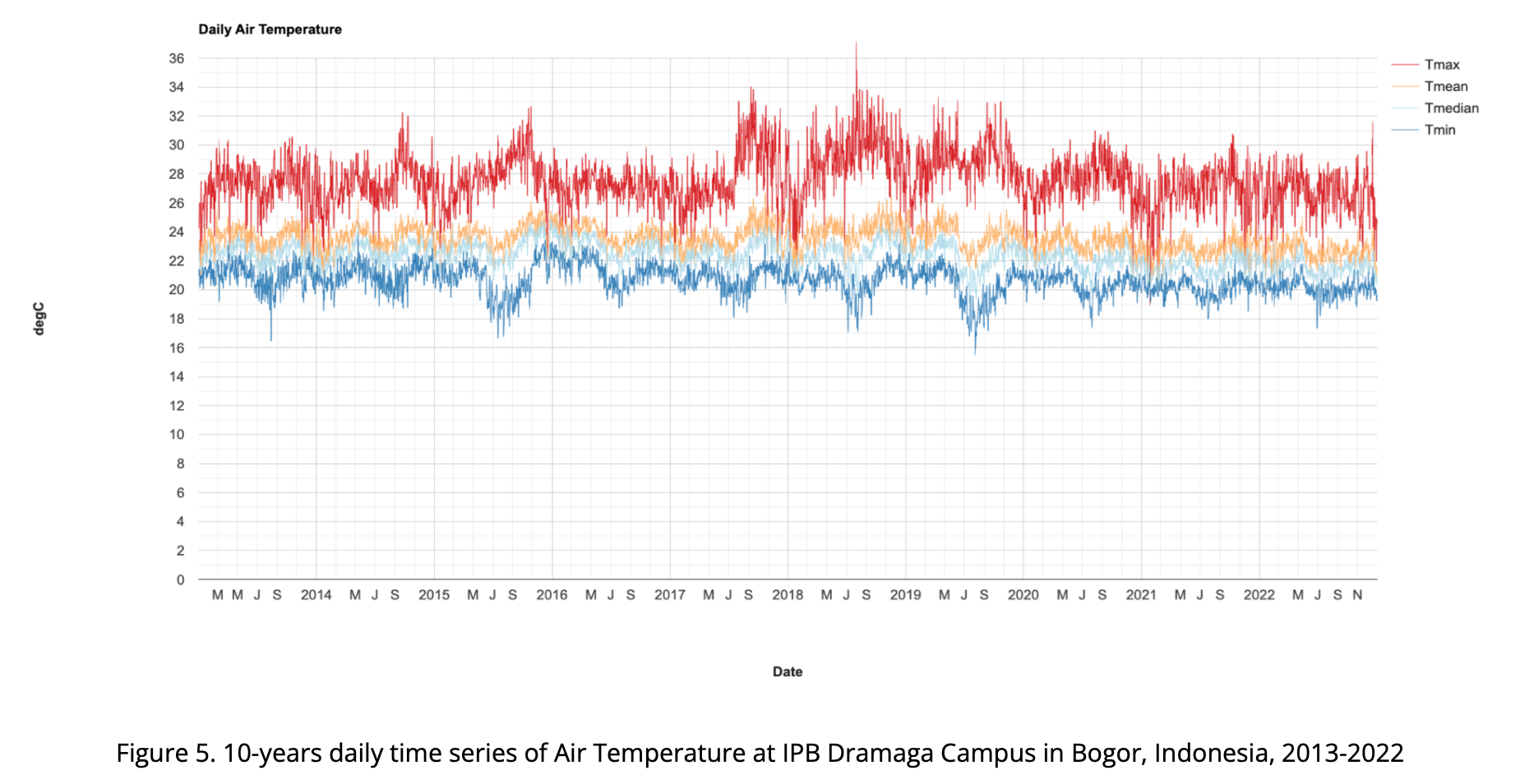 From this data, we can see that the average daily temperature at IPB Dramaga Campus in Bogor is 26.5°C. The median temperature over this time period is 25.0°C. The range of temperatures over this 10 year period is 2°C, and the standard deviation is 1.2°C.