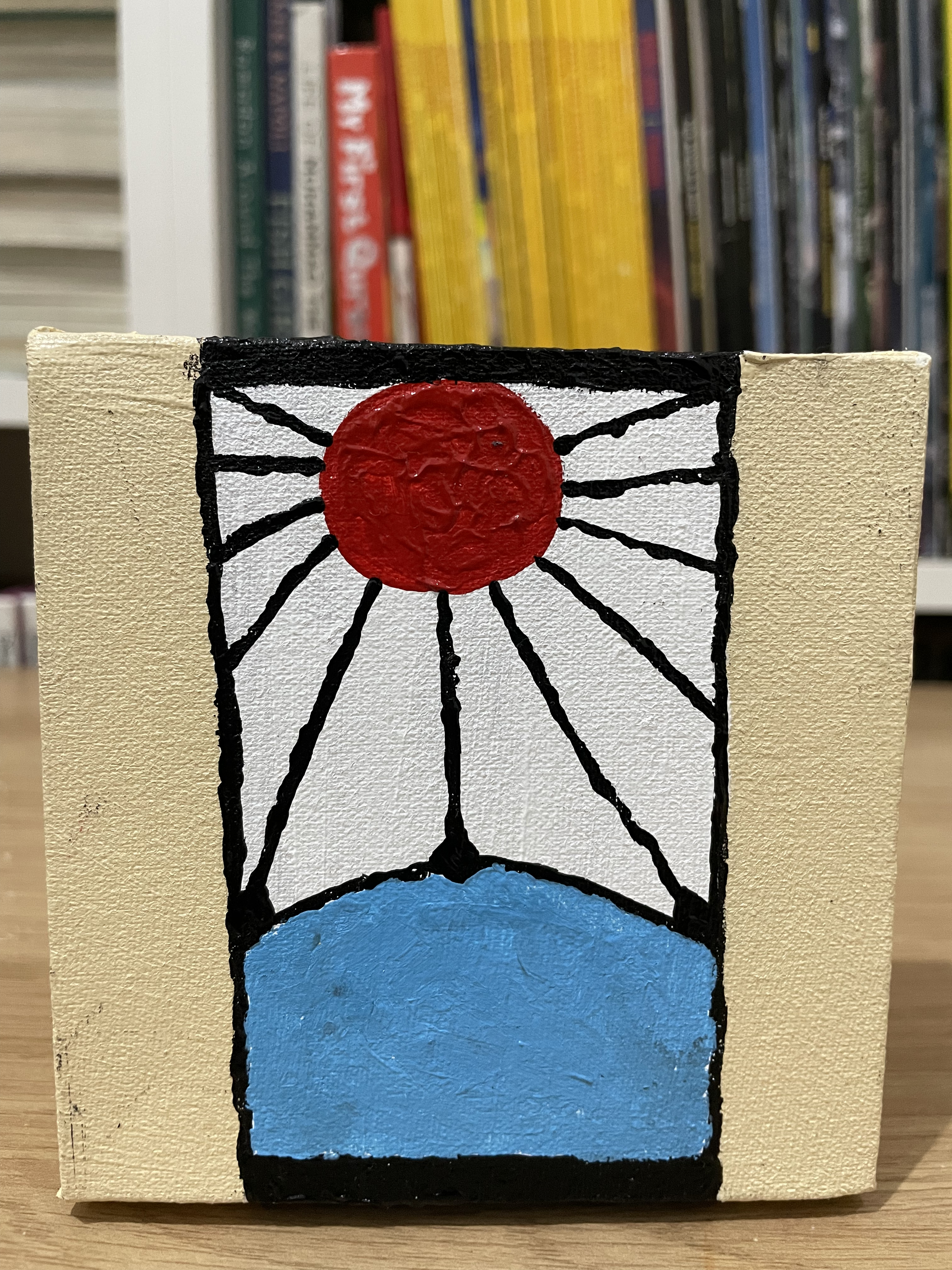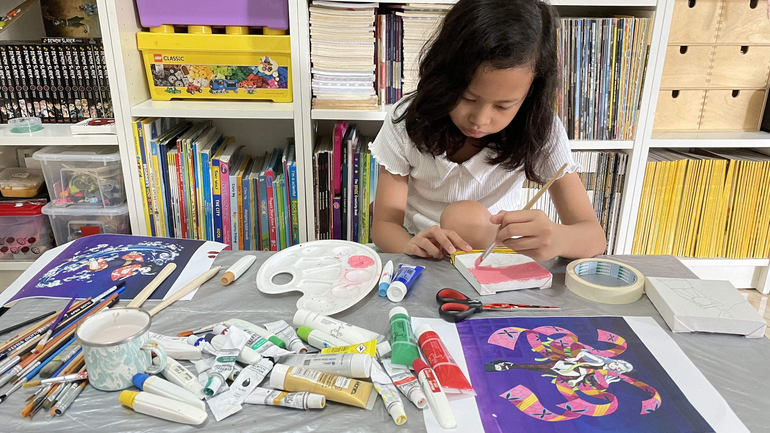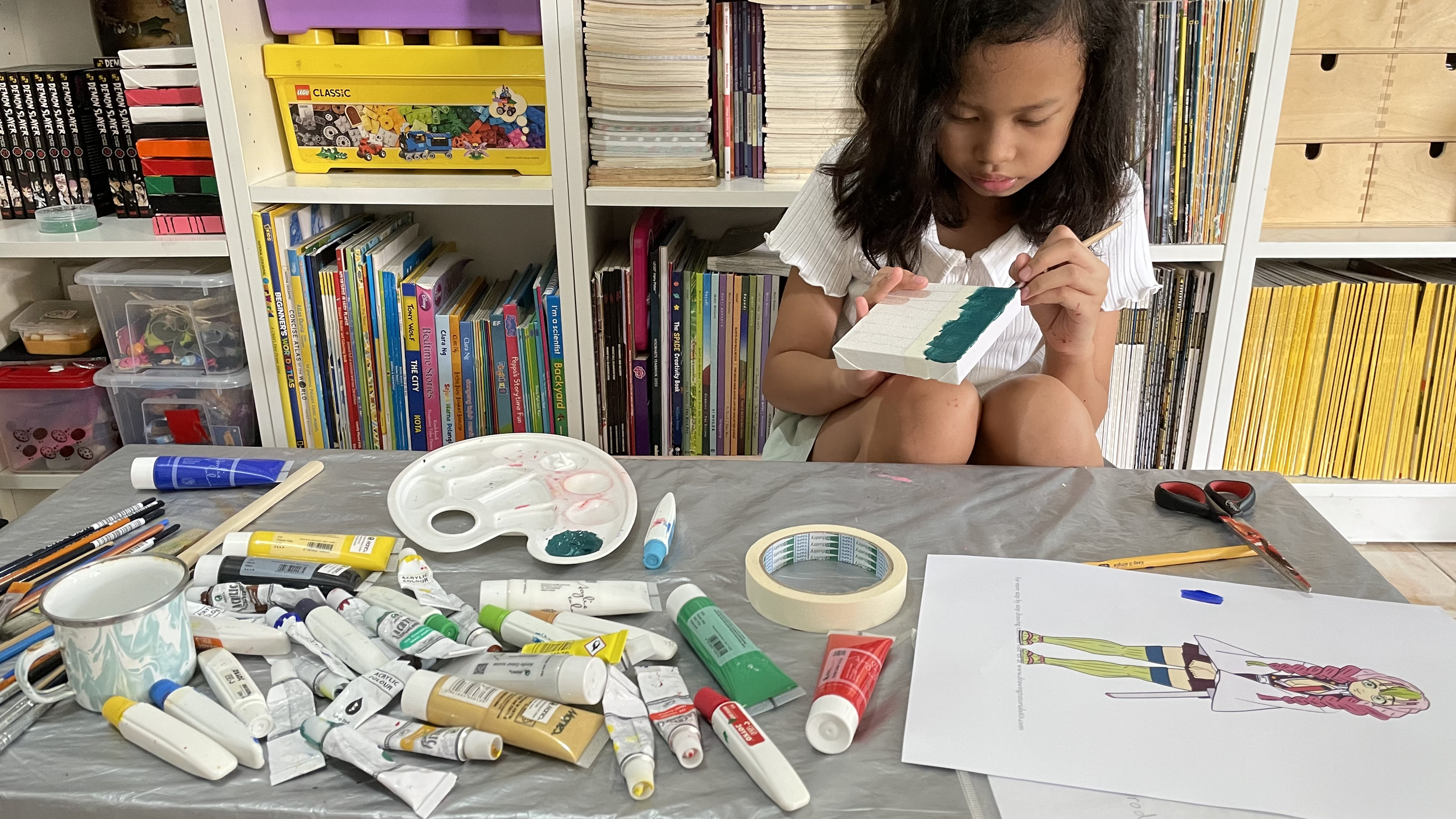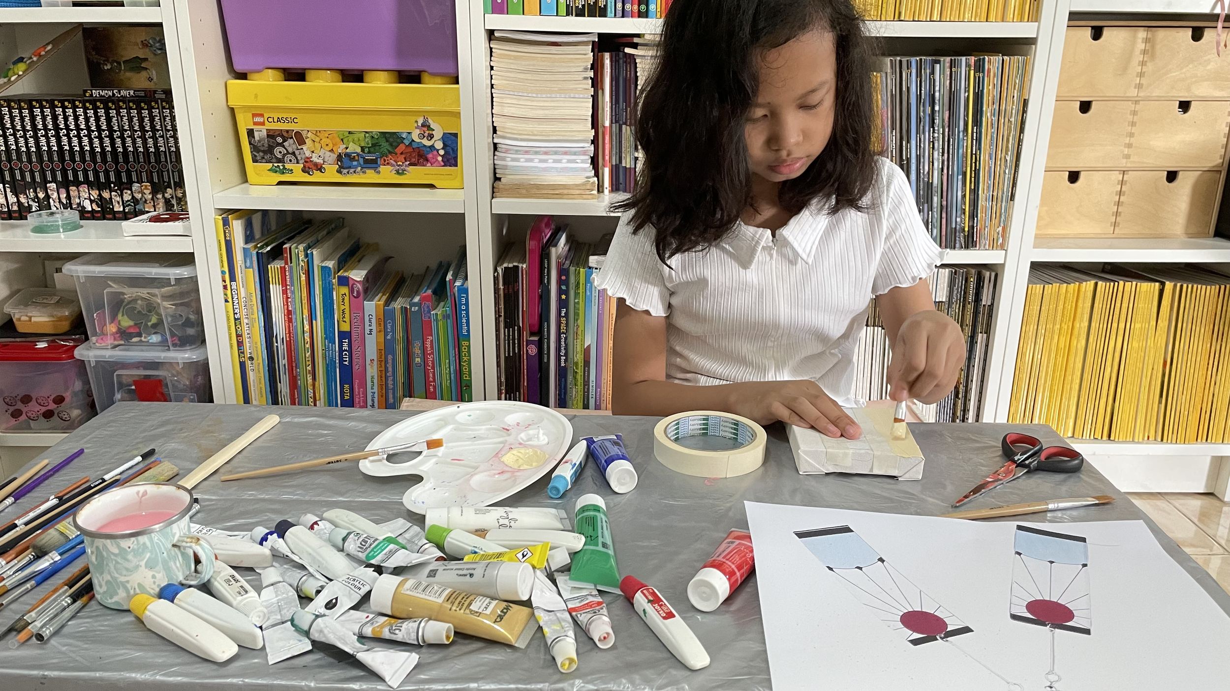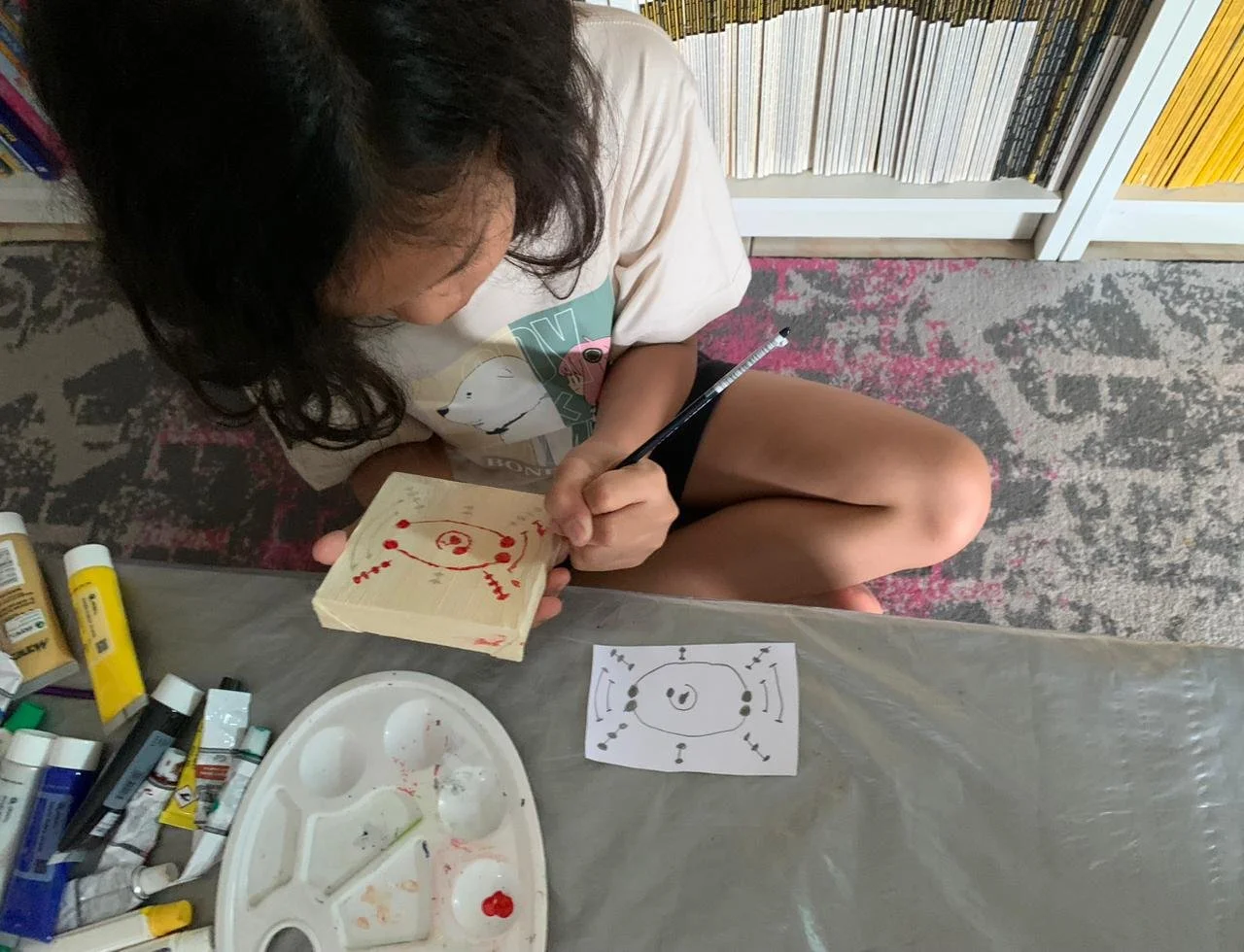Our creative process was both fun and educational. We began with the fundamentals – applying white (or other color, depending on the character) basecoats to all canvases before letting them dry in the warm sunlight. I guided her in drawing pencil guidelines to create clean color boundaries.