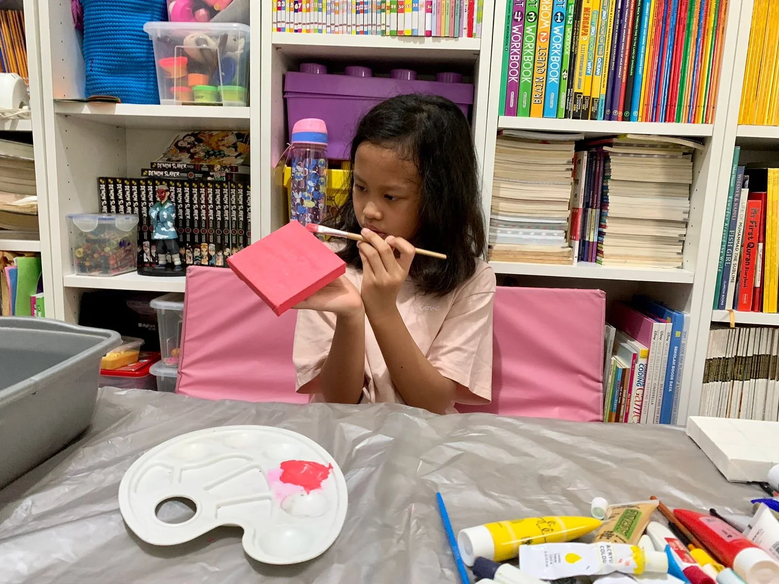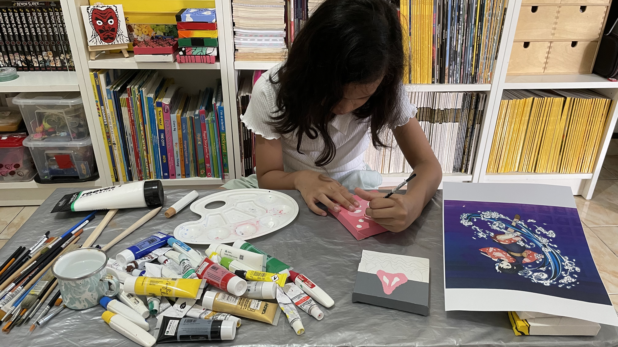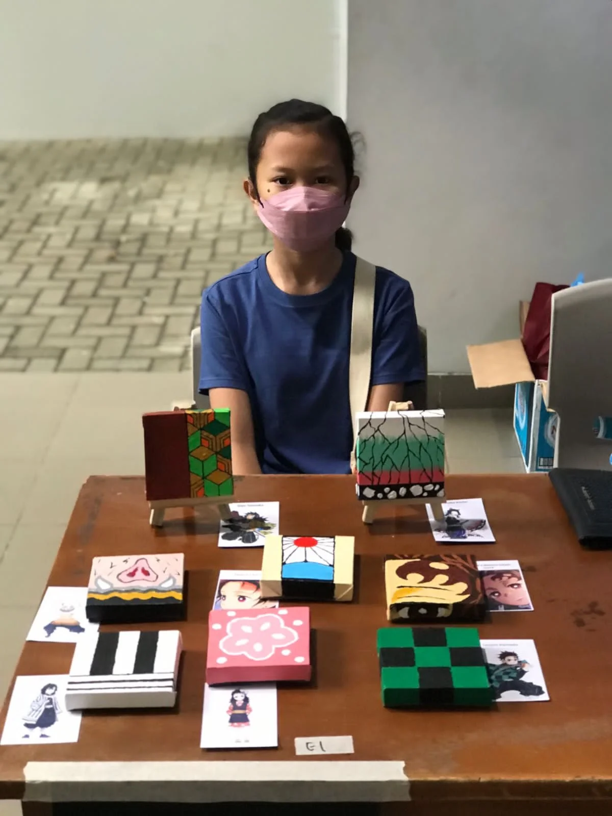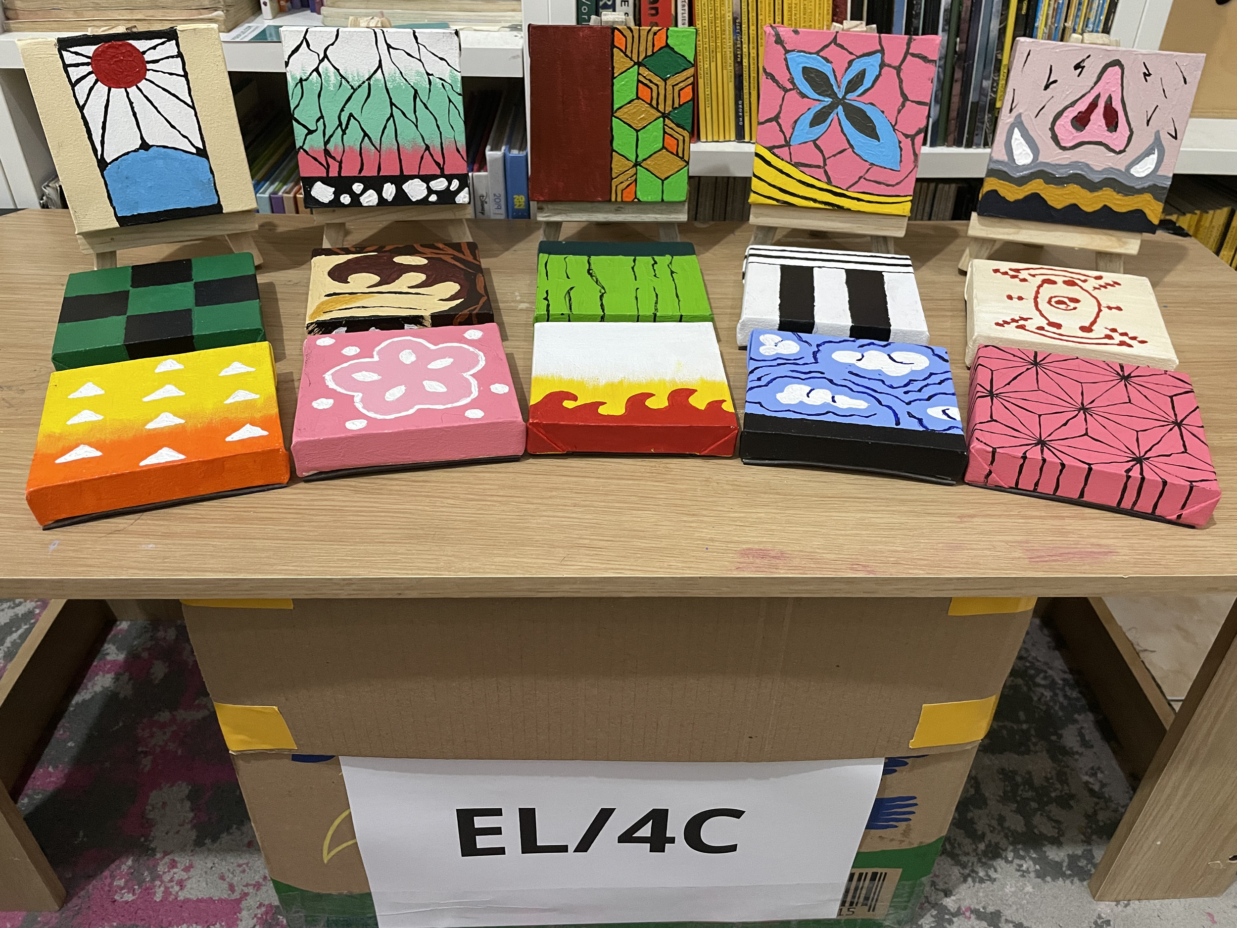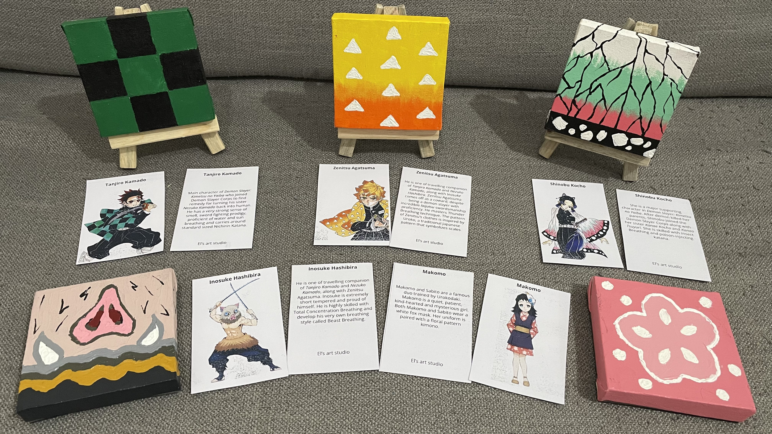 While many of her classmates chose to sell food items, my daughter envisioned something unique. As an enthusiastic Demon Slayer fan with the complete English manga series from VIZ (volumes 1-23) and a love for the Netflix series, she decided to blend her artistic talents with her favorite anime. Her creative spark led to the idea of hand-painted Demon Slayer-themed artwork on small canvases.