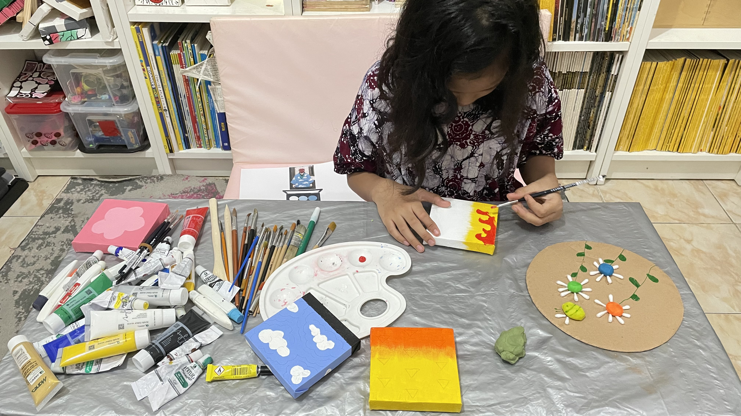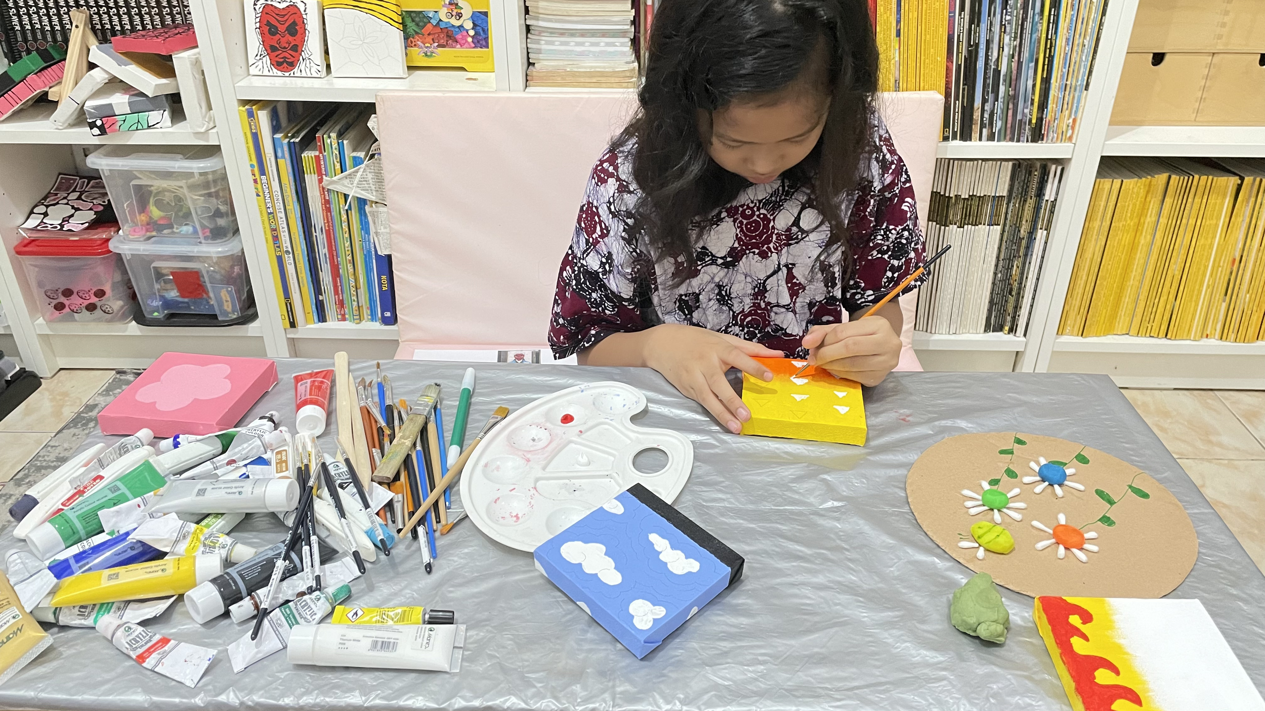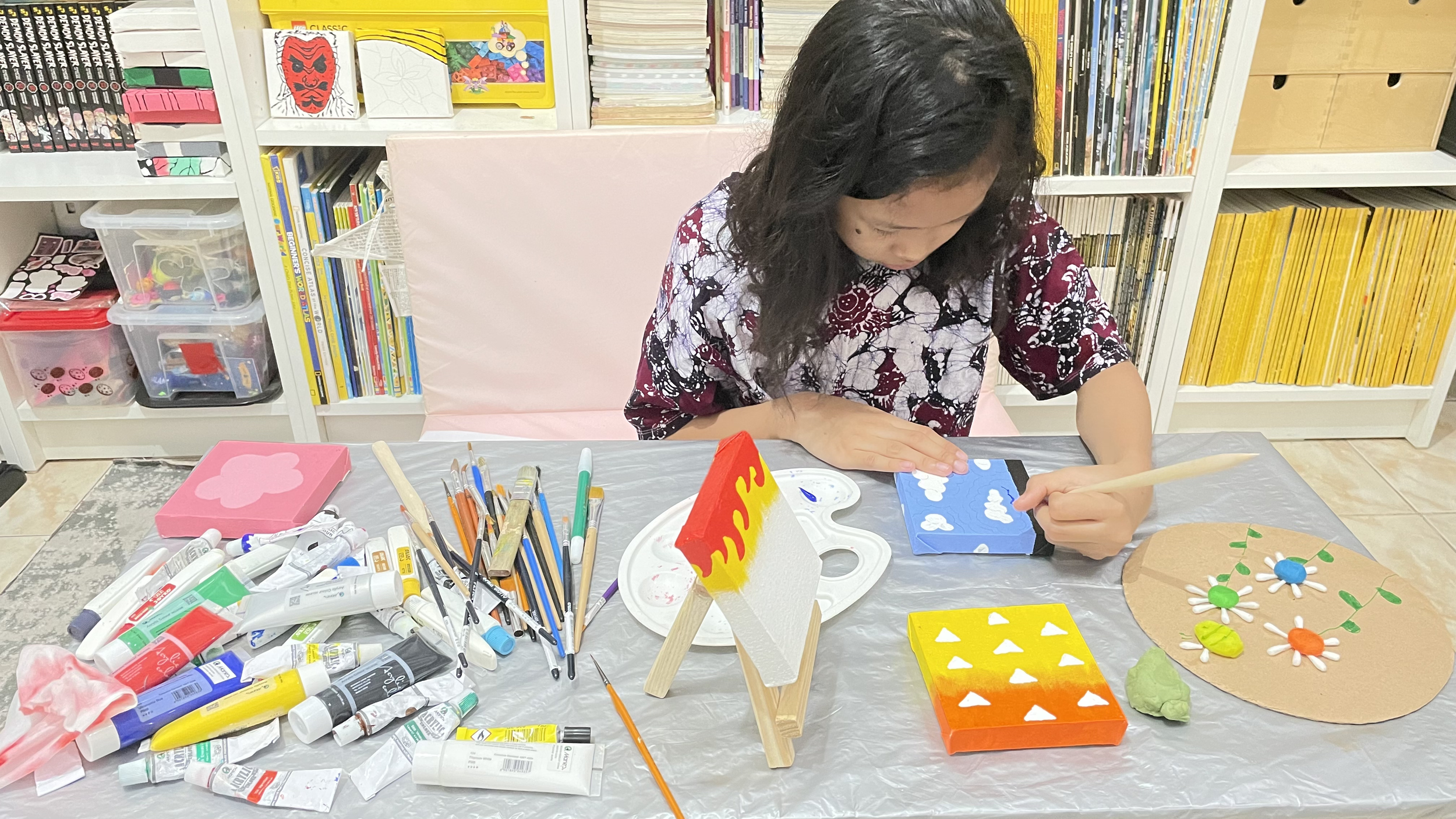 Supporting her vision, we visited KKV a month before the market day to gather supplies: 20 small 10x10 cm canvases, acrylic paints, and various art materials. Together, we explored different color patterns that would bring her beloved characters to life through art.