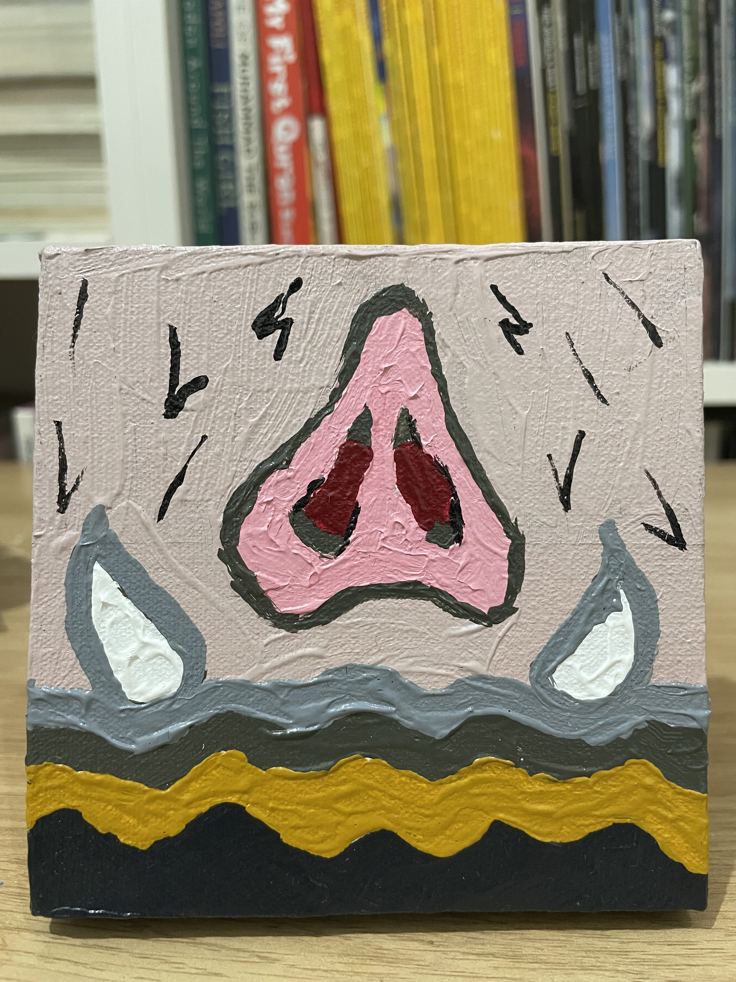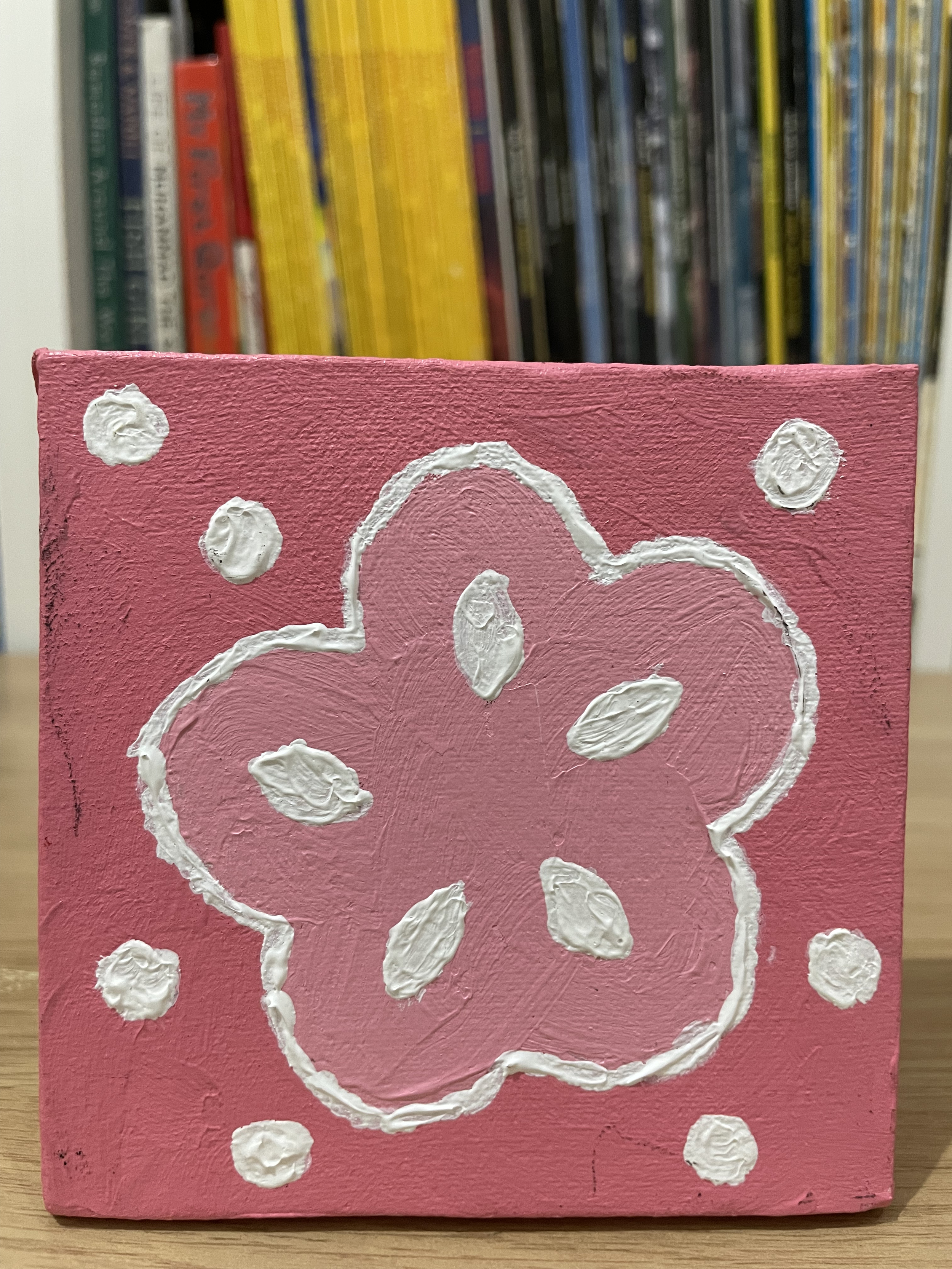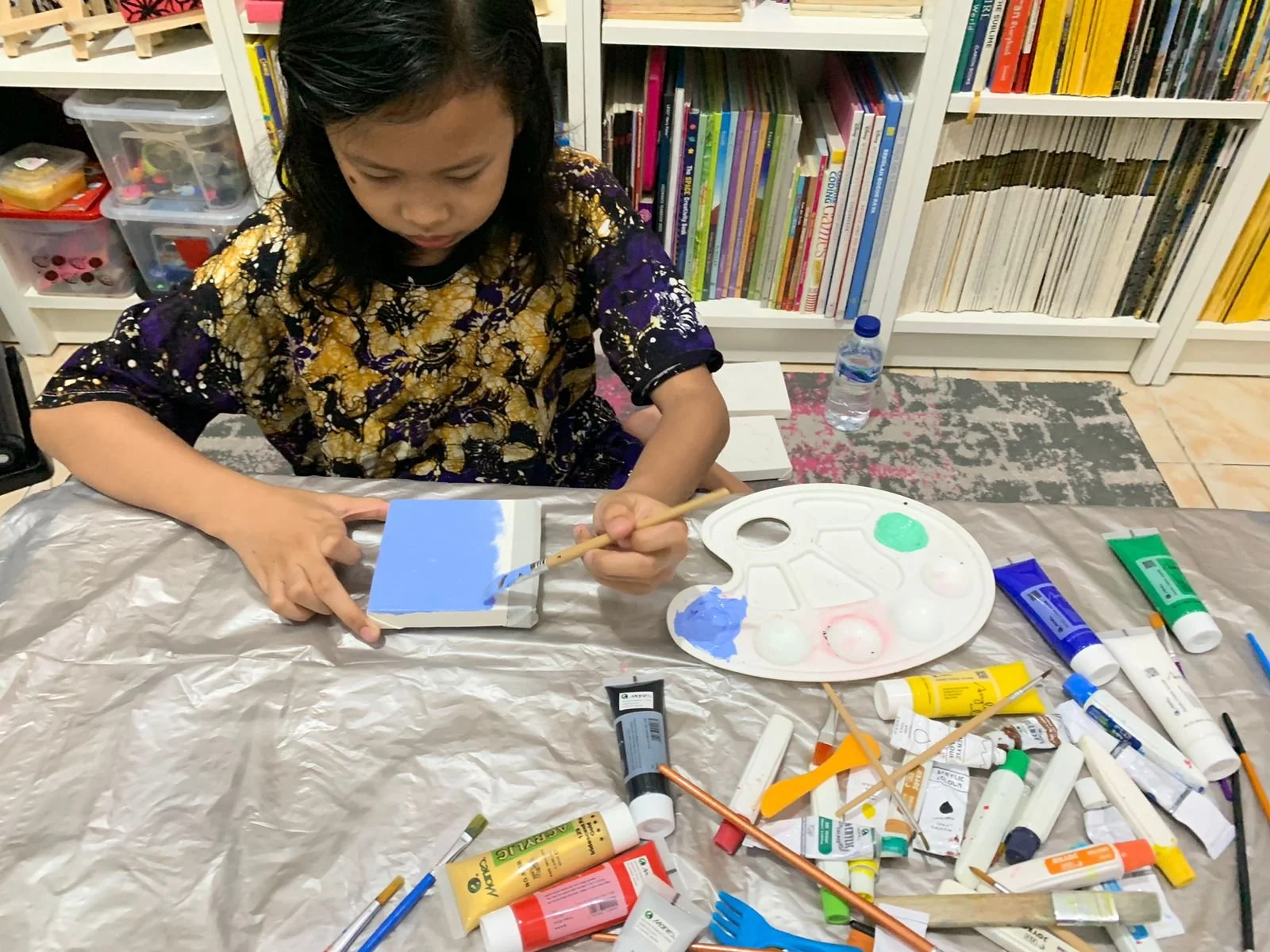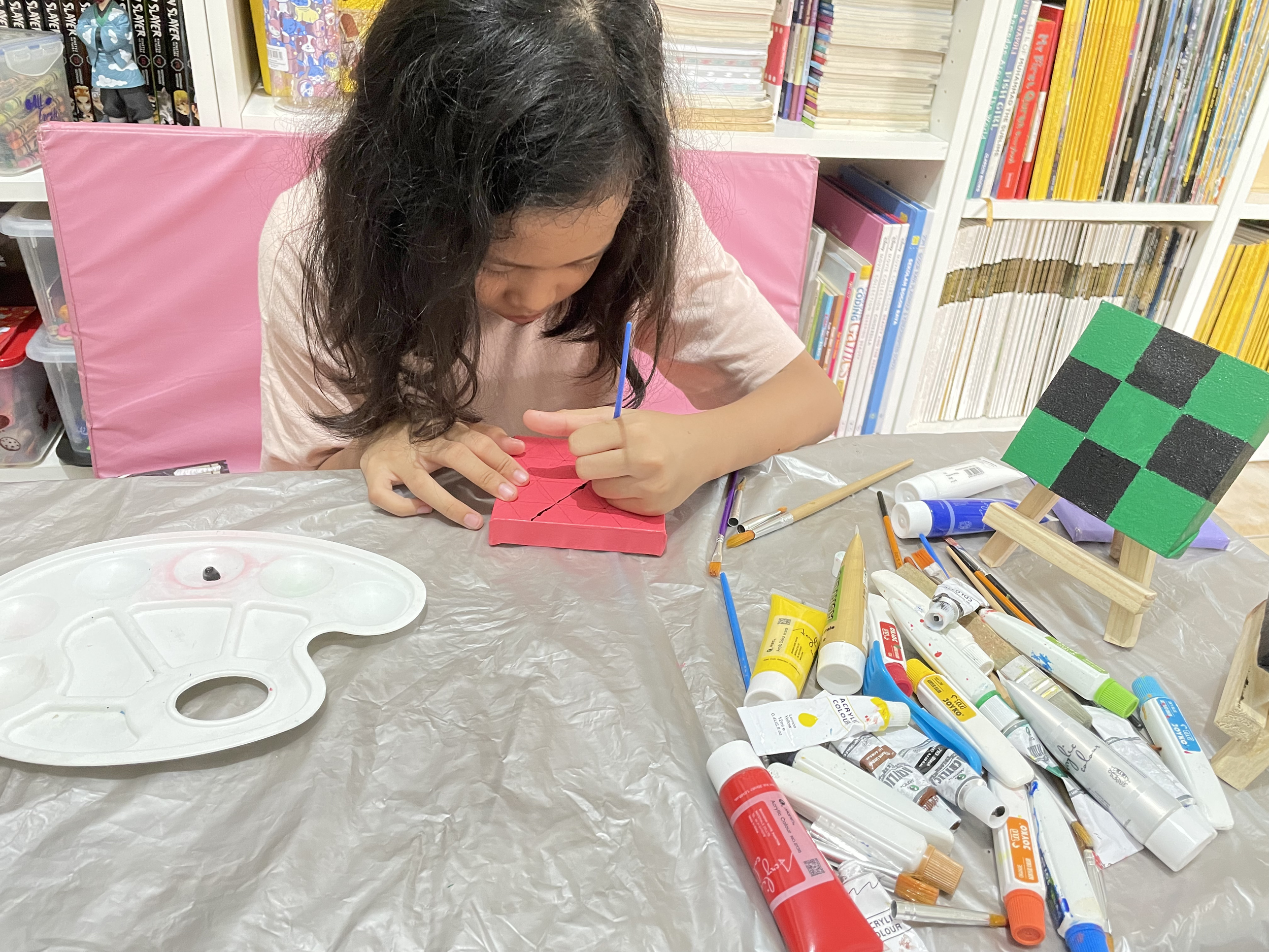 Supporting her vision, we visited KKV a month before the market day to gather supplies: 20 small 10x10 cm canvases, acrylic paints, and various art materials. Together, we explored different color patterns that would bring her beloved characters to life through art.