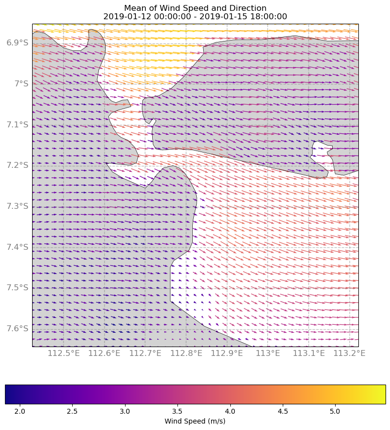 A streamline plot can be used to show the flow of wind direction and speed at a particular time during the three-day period. This type of plot is useful for identifying the flow of wind over a geographic area. You can use Python libraries such as Matplotlib, Cartopy, or Basemap to create streamline plots.