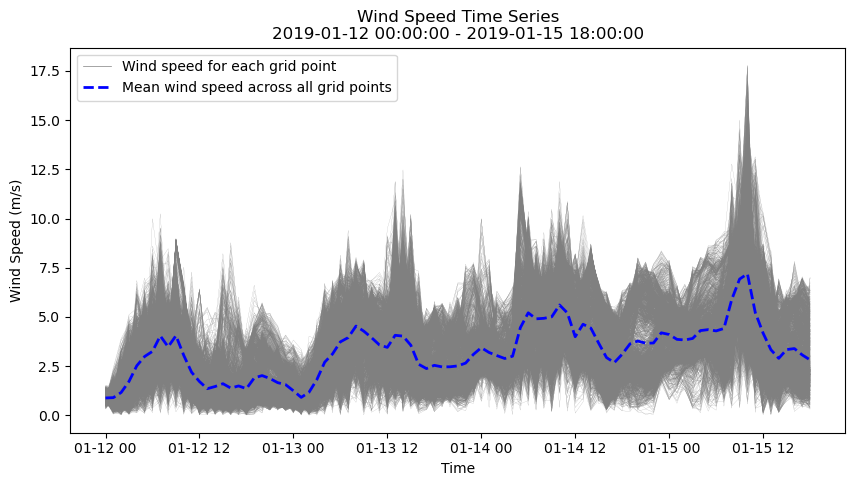 We can create a time series plot showing the variation of wind speed and direction over the three-day period. This type of plot is useful for identifying patterns or trends in the data over time. We can use Python libraries such as Matplotlib or Seaborn to create time series plots.
