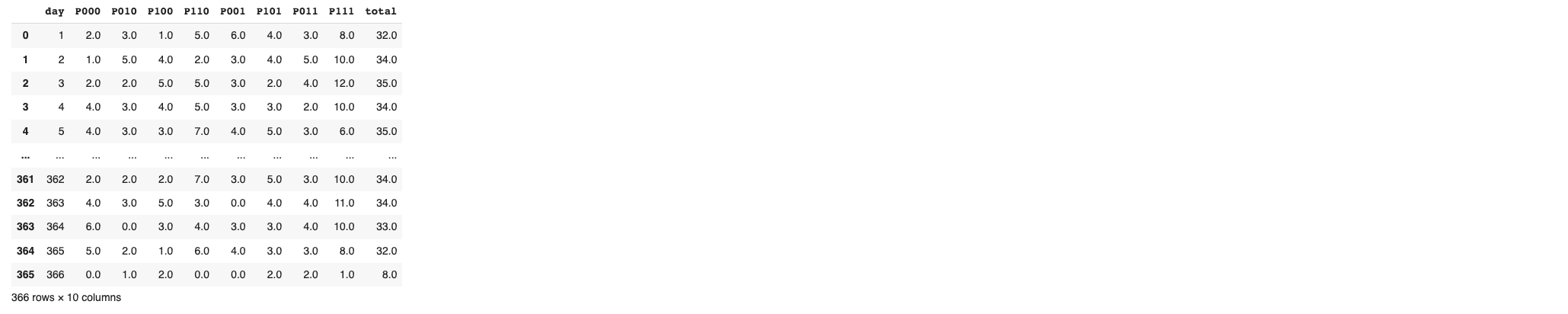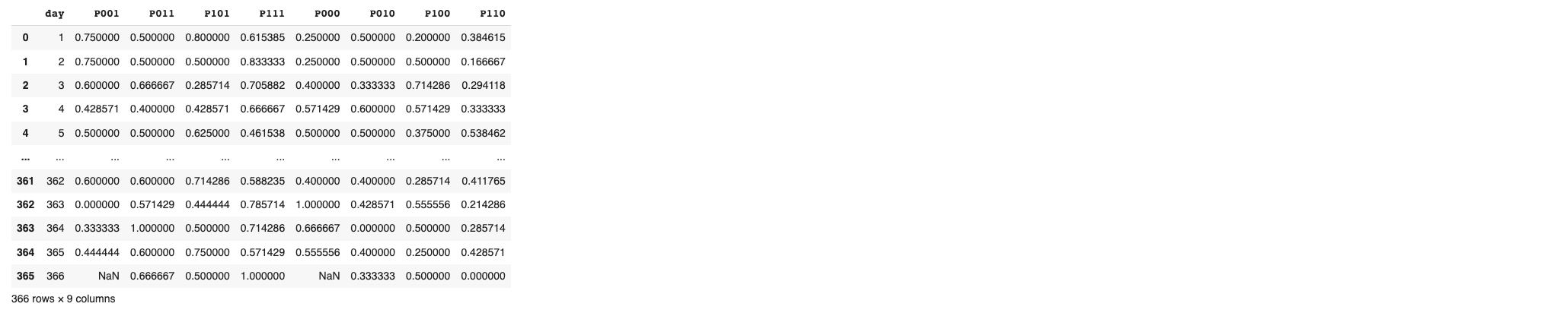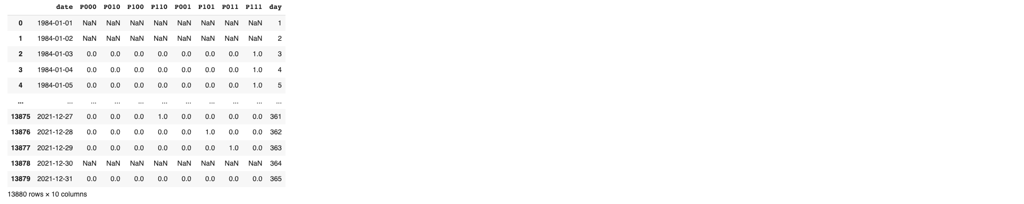 This code below is responsible for calculating the total number of occurrences per day for each of the eight possible weather state transitions (P000, P001, P010, P100, P110, P101, P011, P111) over the entire period of the dataset.