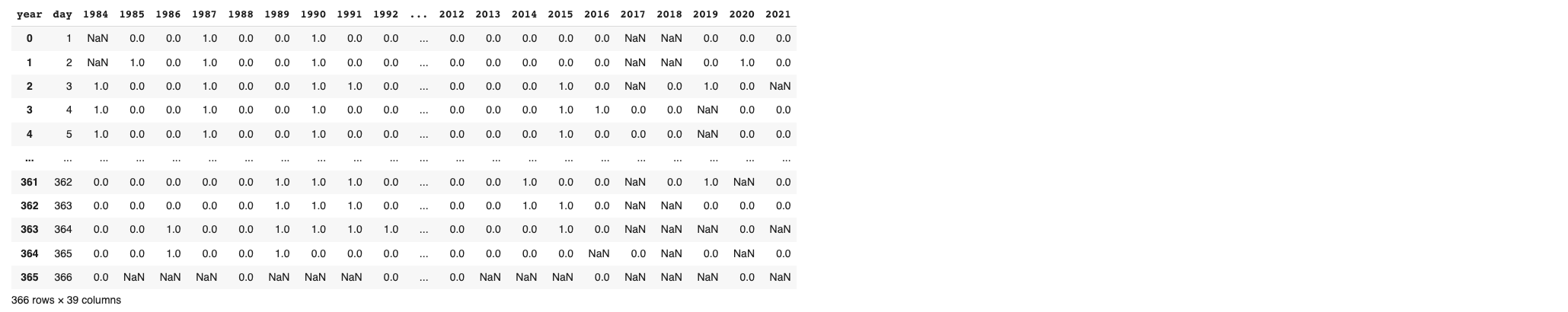 Then, it loops over each event type, creating a 2D array filled with NaNs to hold the event data for each day of each month. The event data is split by month and filled into this array, ensuring the correct day and month placement for each event.