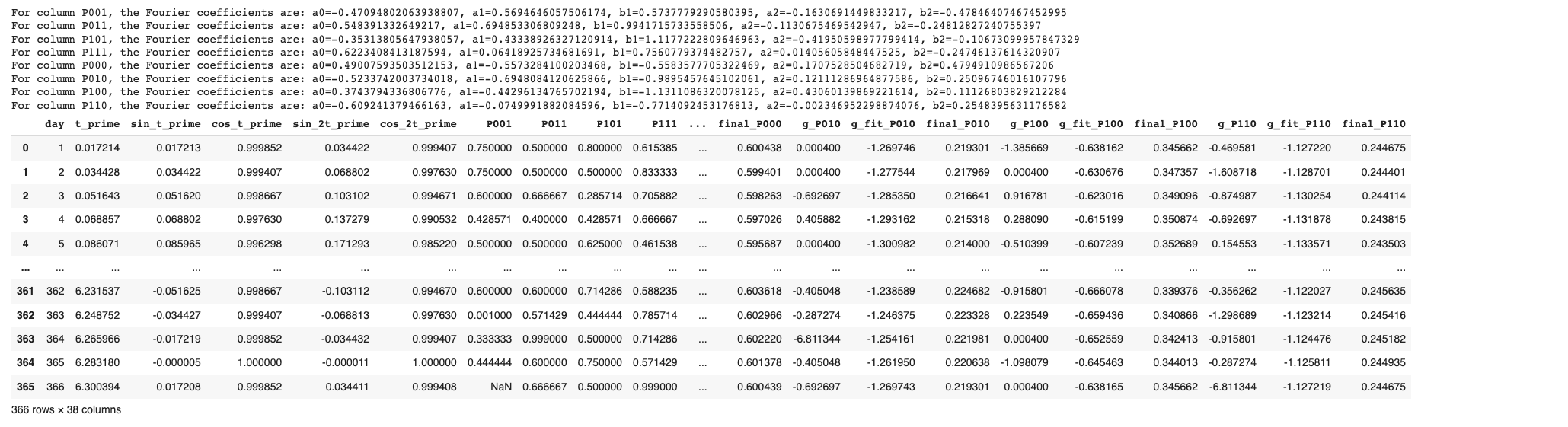 The code calculates Fourier coefficients and applies a logit transformation to the probability values in a pandas DataFrame prob_df. First, it modifies prob_df, replacing any instances of 0 or 1 probabilities with a small constant epsilon or 1 - epsilon respectively. This prevents errors when applying logarithms and exponentials later in the process. The script then calculates a set of variables based on the day of the year, including trigonometric functions sin_t_prime, cos_t_prime, sin_2t_prime, and cos_2t_prime based on the day of the year scaled by 2*pi/365 to reflect the cyclical nature of the calendar.