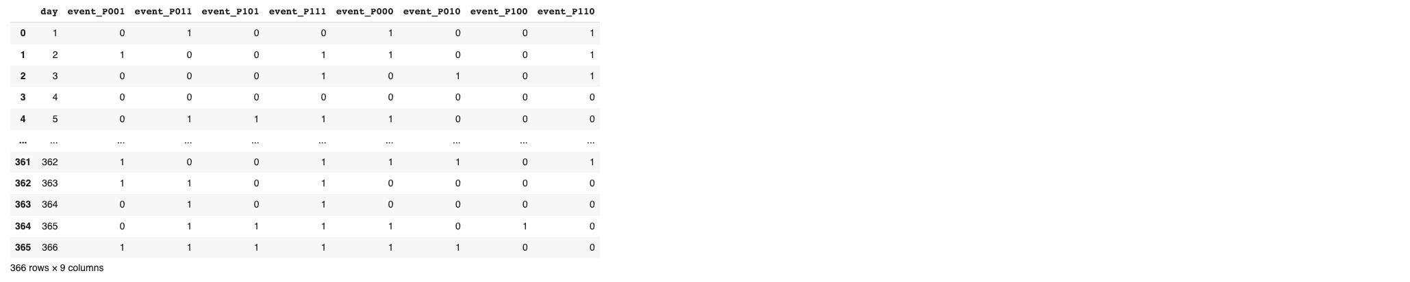 This code generates random numbers from a uniform distribution for each day and compares these to our probabilities to generate the events. Events are coded as 1 for rain and 0 for no rain. The new DataFrame event_df only contains the event data, with columns named event_Pxxx as specified. The data is saved in a CSV file called events.csv.