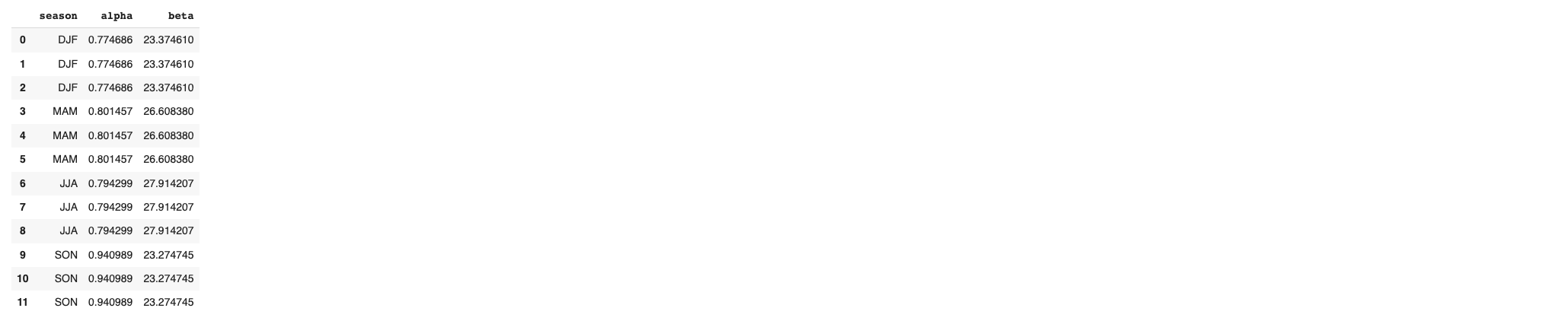 This code analyses a dataset of rainfall patterns. It first loads the data, and prepares it by converting the ‘date’ column into a datetime format and adding a ‘month’ column. It then assigns each entry to a season (DJF, MAM, JJA, or SON) based on the month of the year. After isolating only the rainy days, the script applies a Gamma distribution model for each season’s rainfall data. The parameters (alpha and beta) of the Gamma distribution for each season are corrected for small sample sizes using the Greenwood and Durand method. These corrected parameters are then stored in a new DataFrame, which is exported as a CSV file for future use or analysis. The resulting DataFrame provides a seasonal breakdown of the rainfall data, and offers insights into how the rainfall pattern is distributed for each season.
