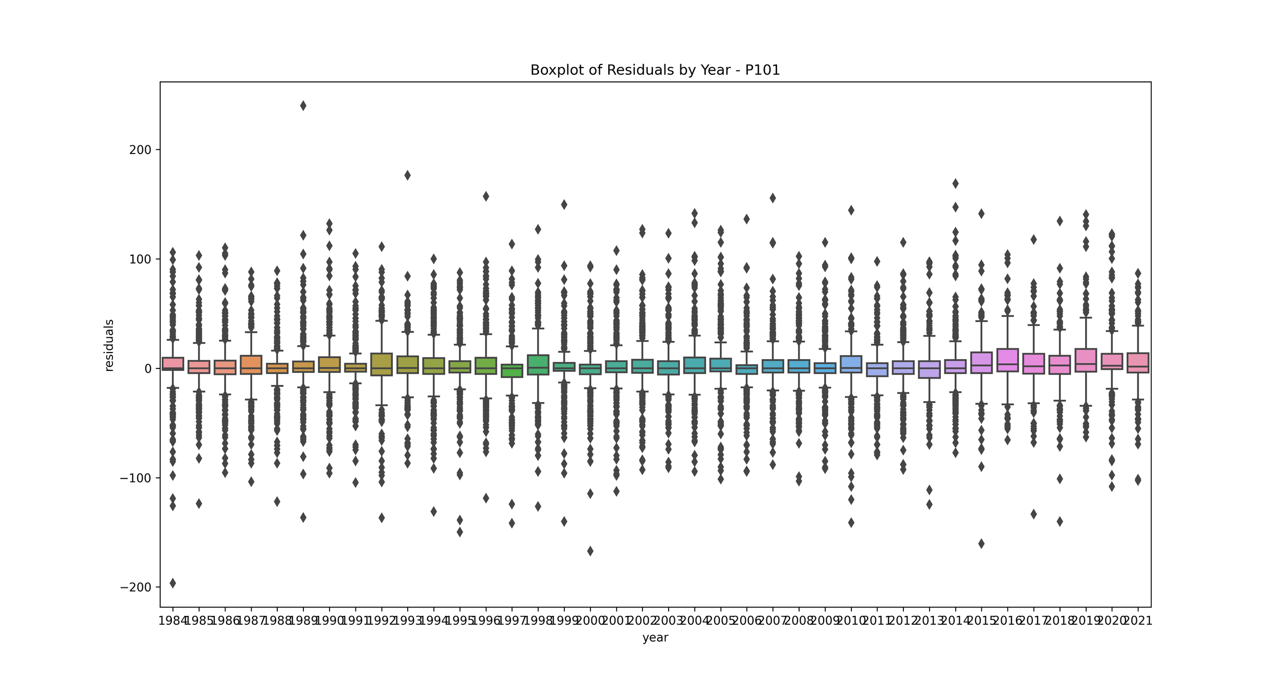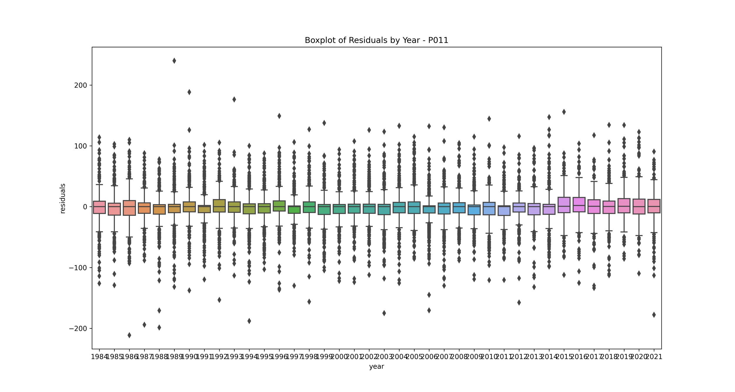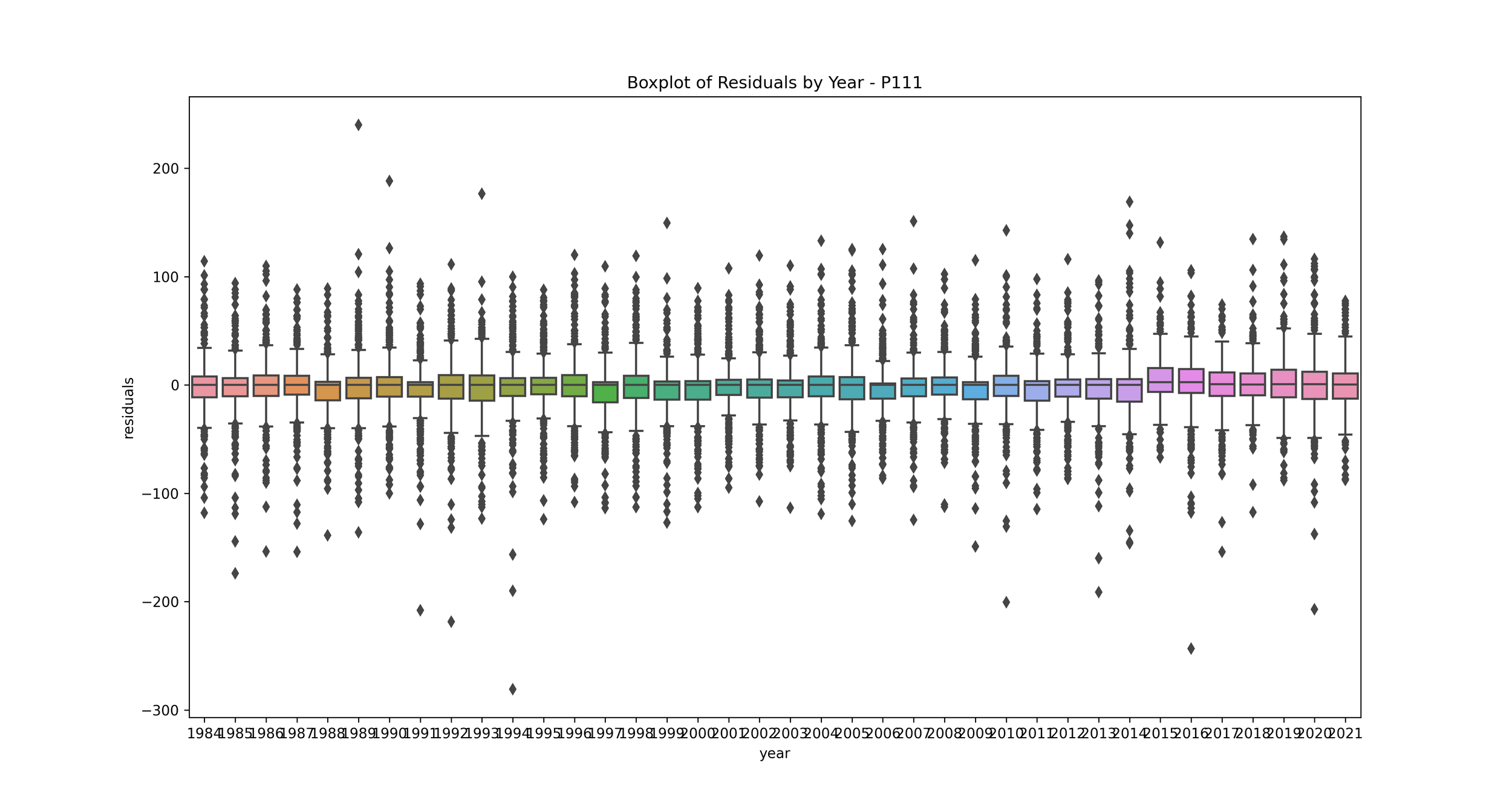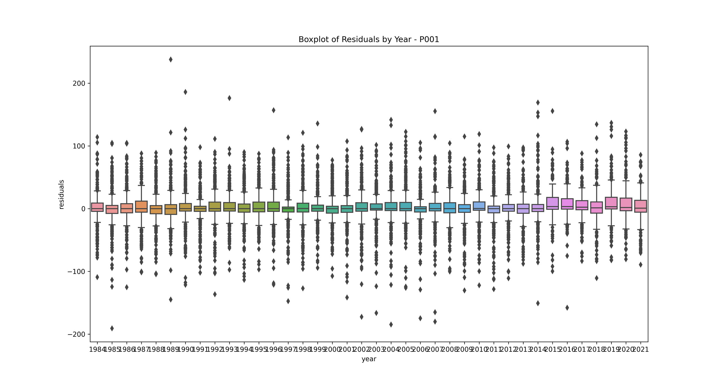 This can help you understand if your model’s performance is consistent over time. If some years have much higher or lower residuals, it may indicate that those years had unusual rainfall patterns that your model didn’t capture. You may want to investigate further to understand what’s causing these discrepancies.