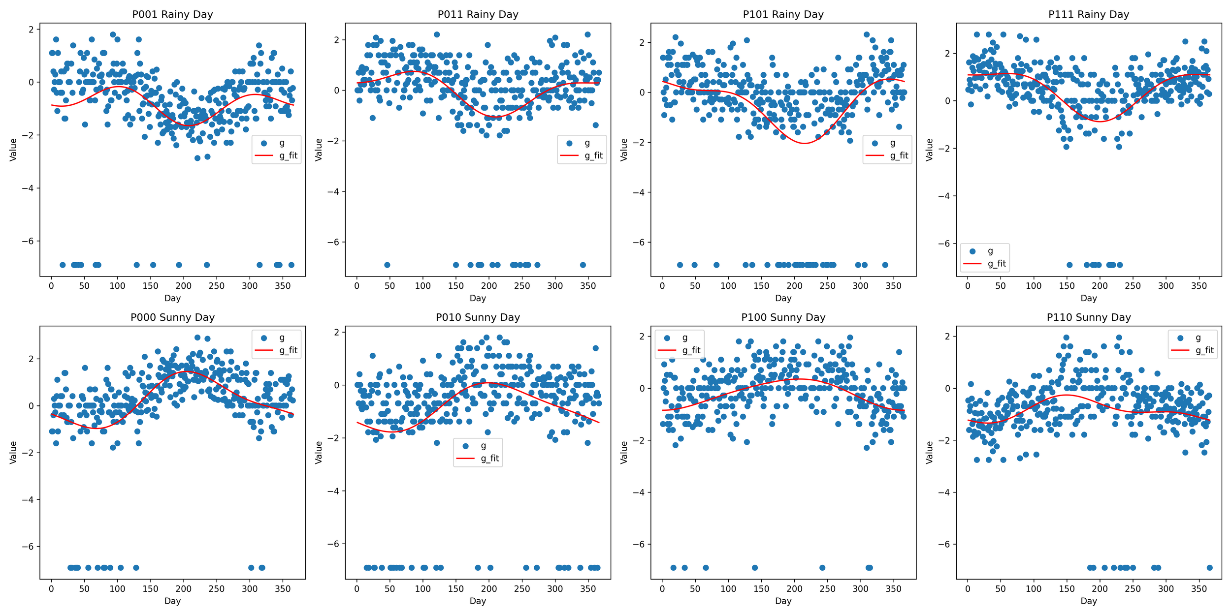 The second row presents the fitting model for dry days (‘P000’, ‘P010’, ‘P100’, ‘P110’). In these plots, the peak of the dry season, occurring in the June-July-August (JJA) period, is prominently reflected in the peak of the g_fit line plot. Conversely, the rainfall is lowest during this period, which is depicted as a valley in the model.