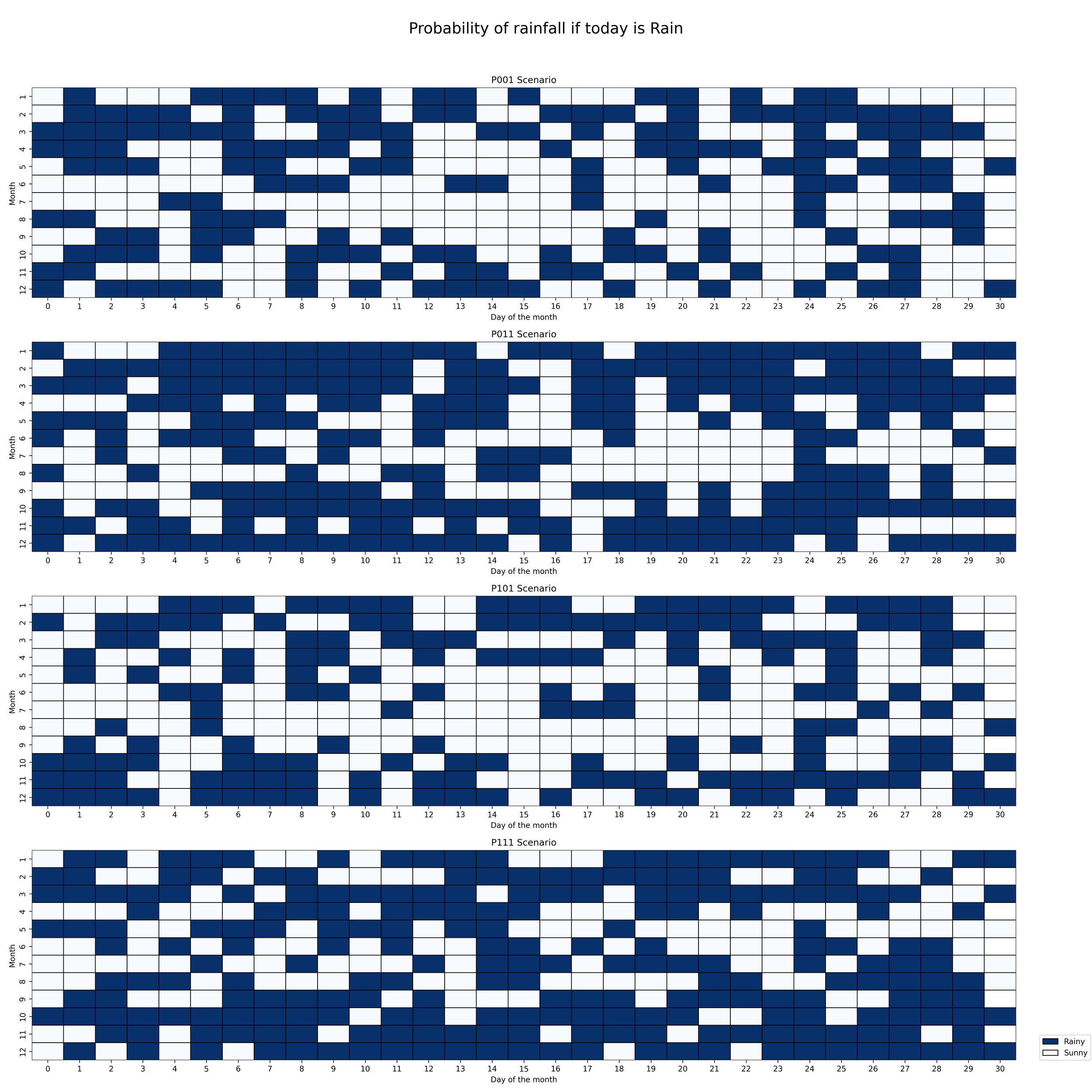 From these heatmaps, one can observe the days and months when rainfall is more or less likely, given that the day is classified as ‘rainy’. These visualizations provide an intuitive understanding of rainfall patterns and their variations throughout the year for each respective scenario.