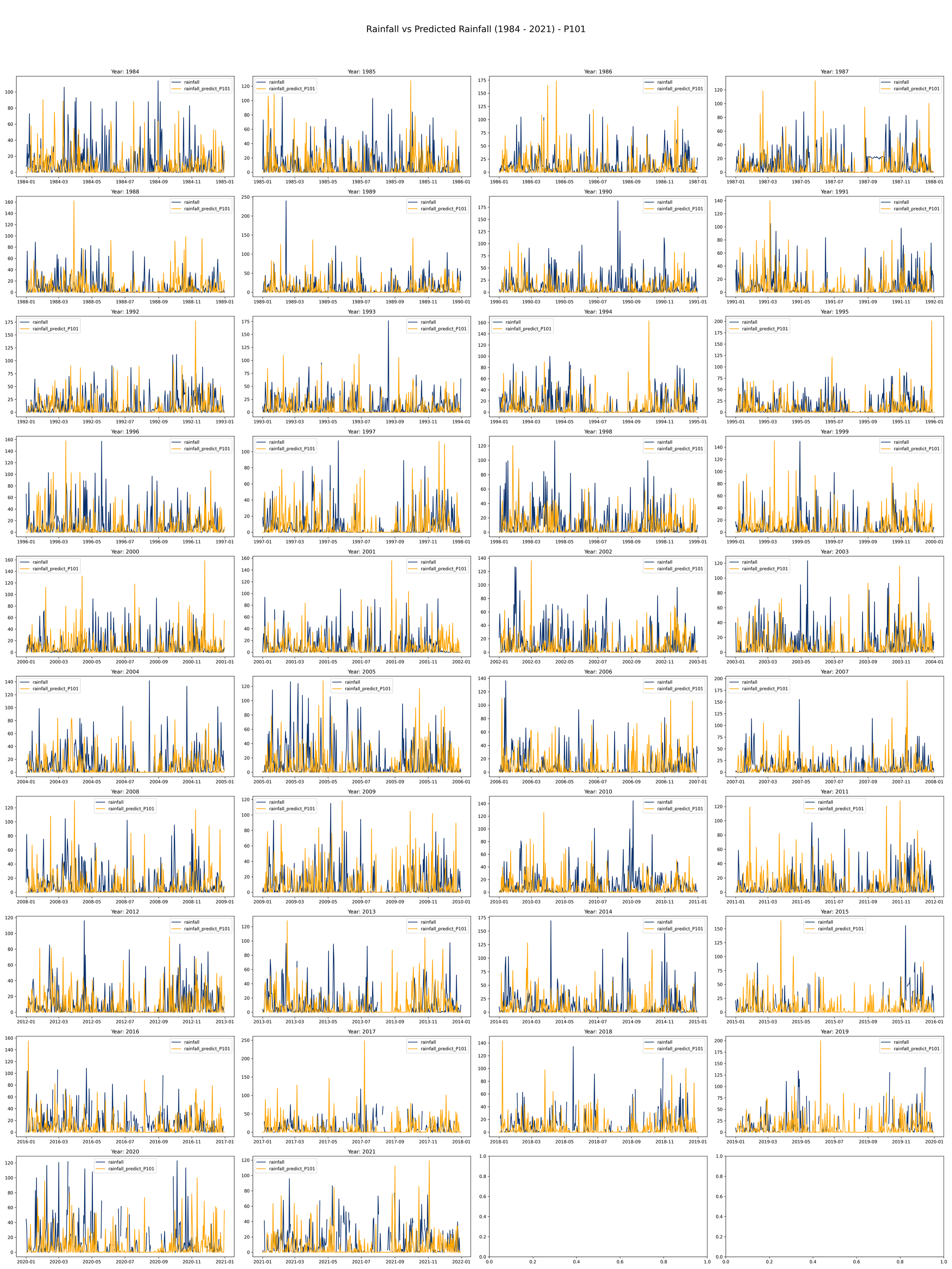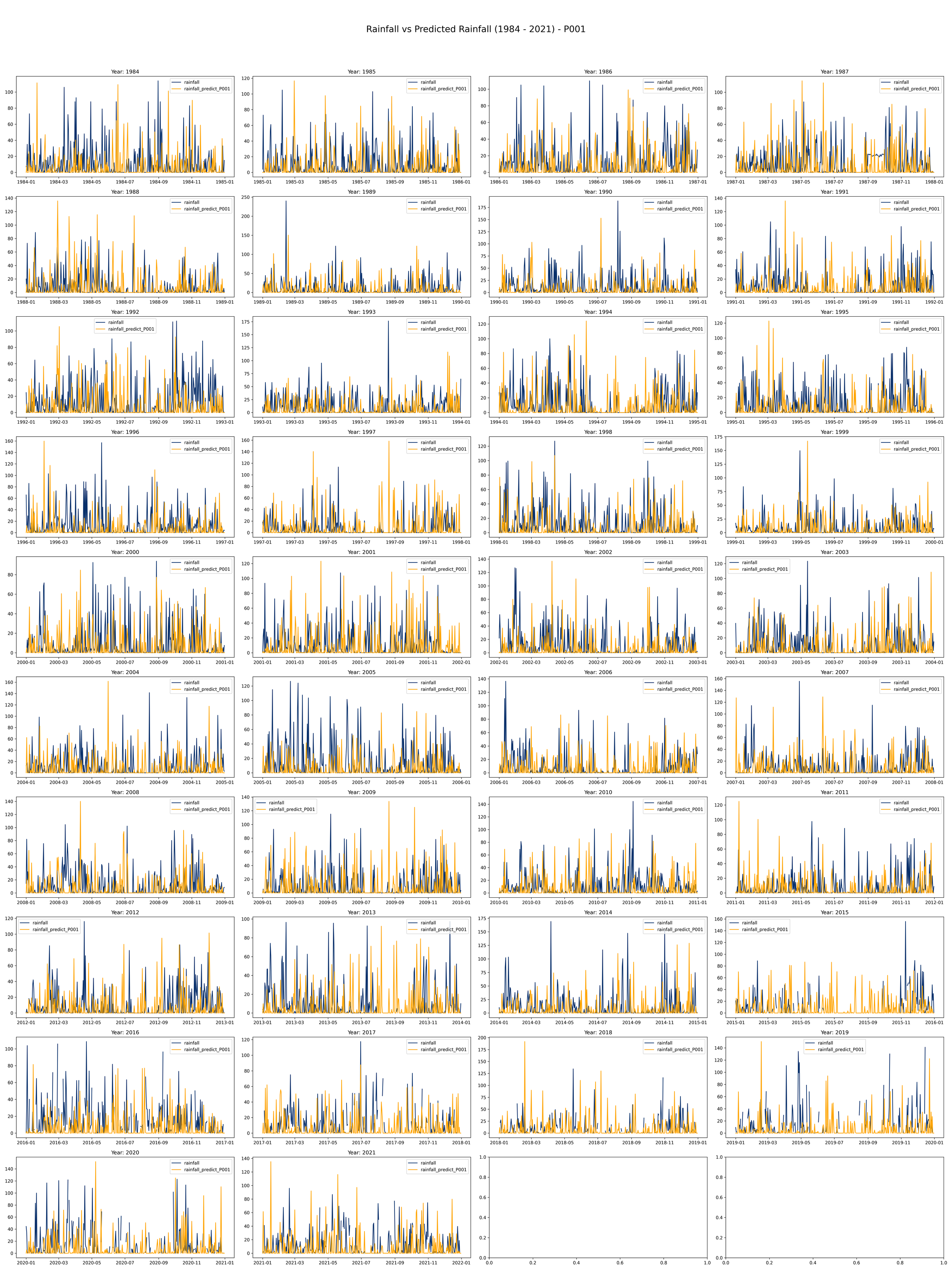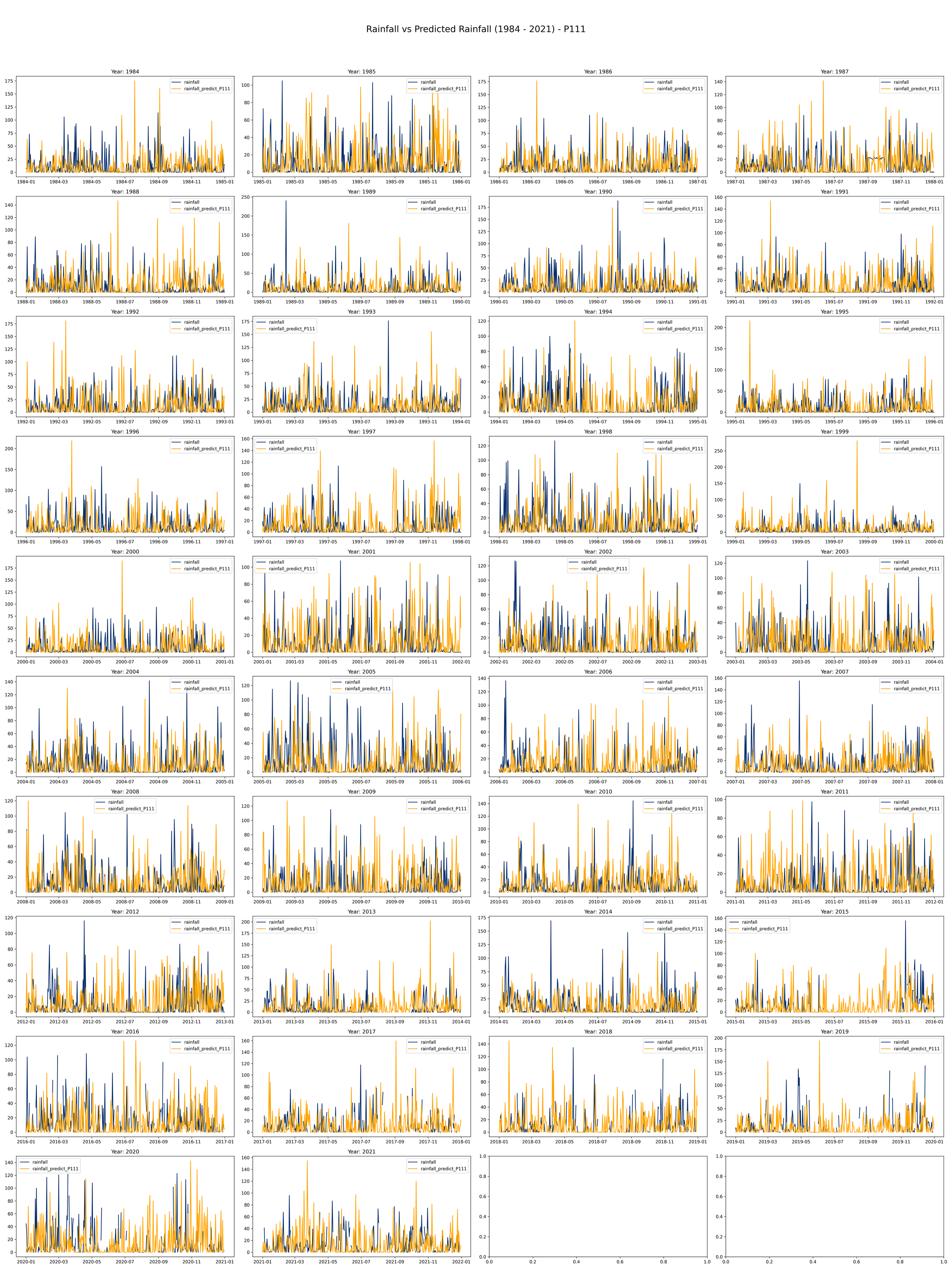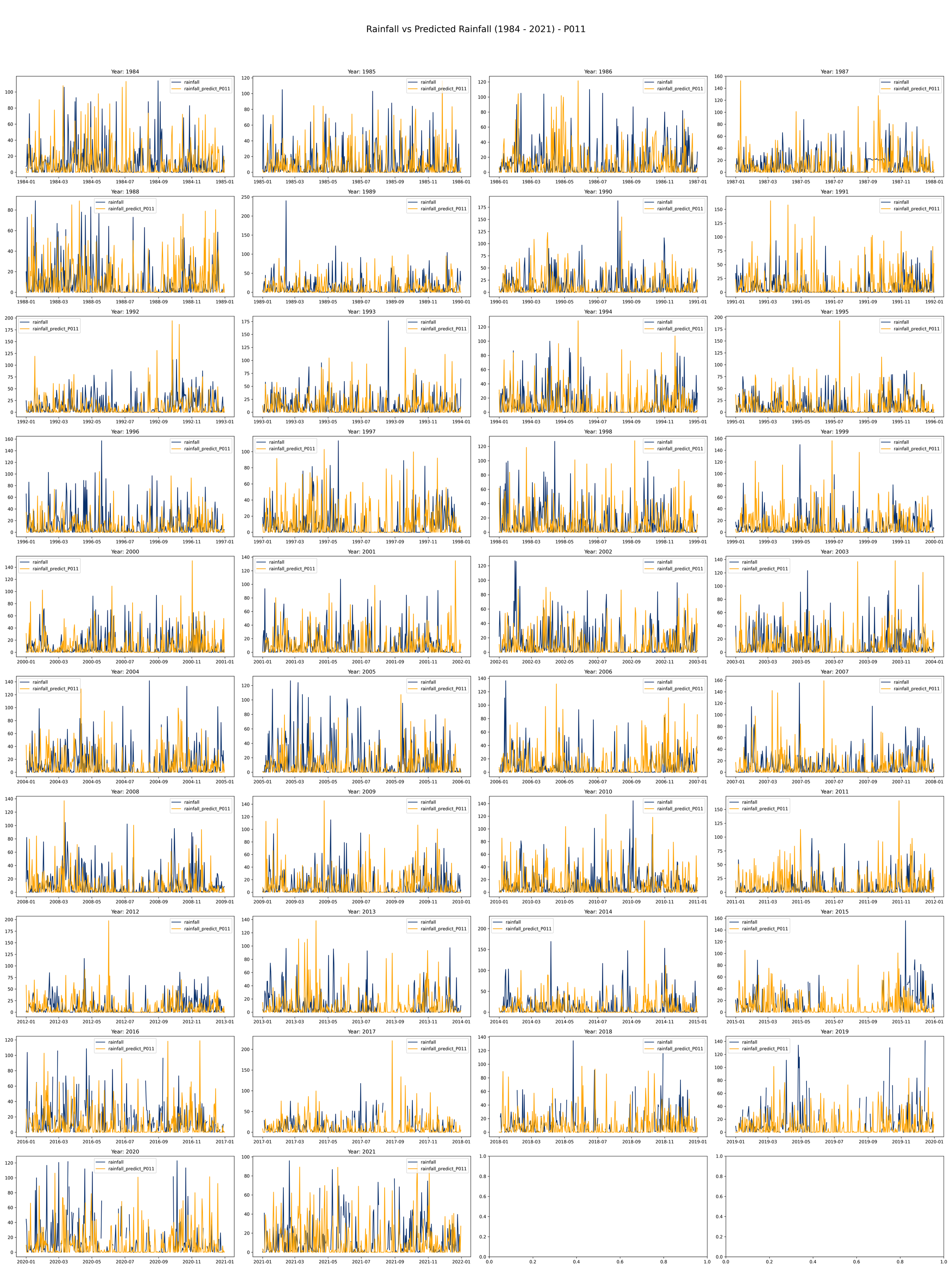 It initializes a plot with 10 rows and 4 columns to make room for a line plot for each year from 1984 to 2021. Each plot will compare actual rainfall (in light blue) with the predicted rainfall (in orange) over the course of a year.