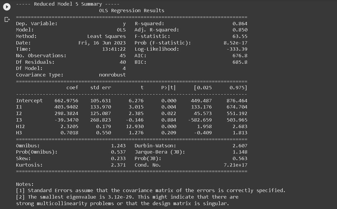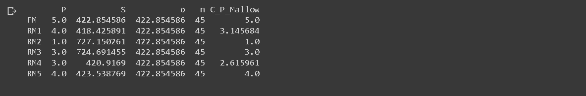 Next, a summary table was created to provide a succinct overview of both the Full Model (FM) and each Reduced Model (RM). This table is essential as it encapsulates vital statistical information about each model. This summary table consists of five columns: P, S, σ, n, and C_P_Mallow, and six rows corresponding to FM’,RM1,RM2’, RM3, RM4, and RM5.