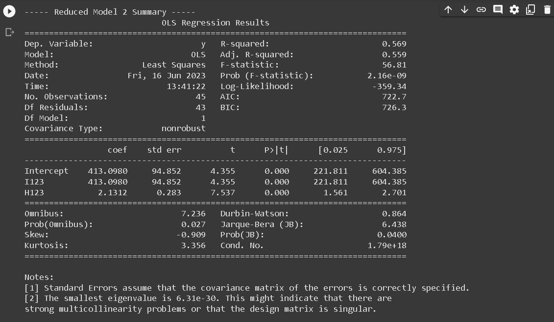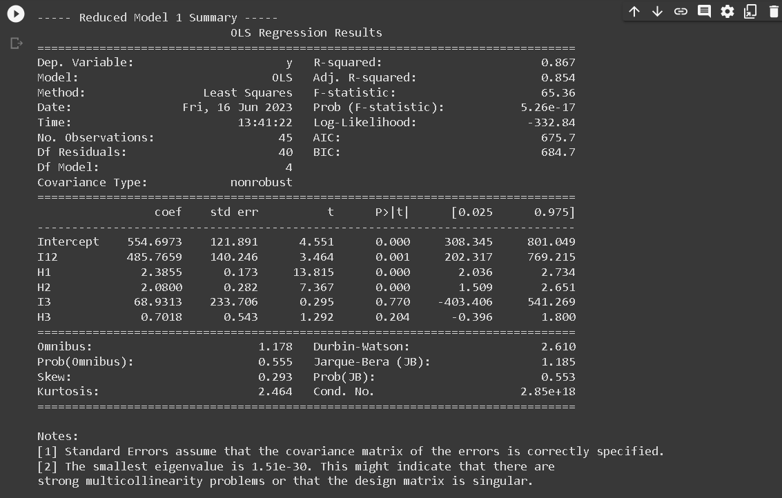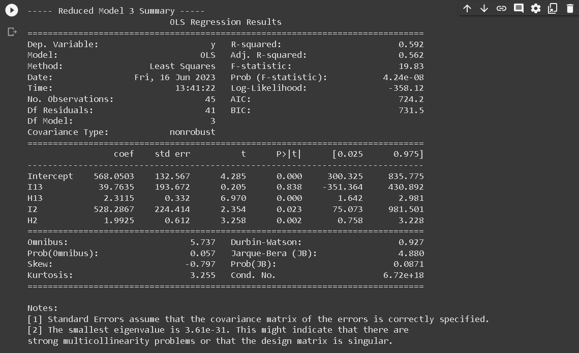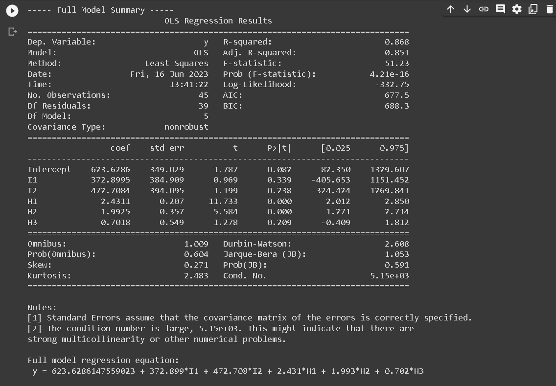 The Full Model regression equation doesn’t include I3 because of a technique used in regression analysis known as dummy coding. When we have a categorical variable with k levels (in this case, region with 3 levels), we need to create k-1 dummy variables to represent it in the regression model.