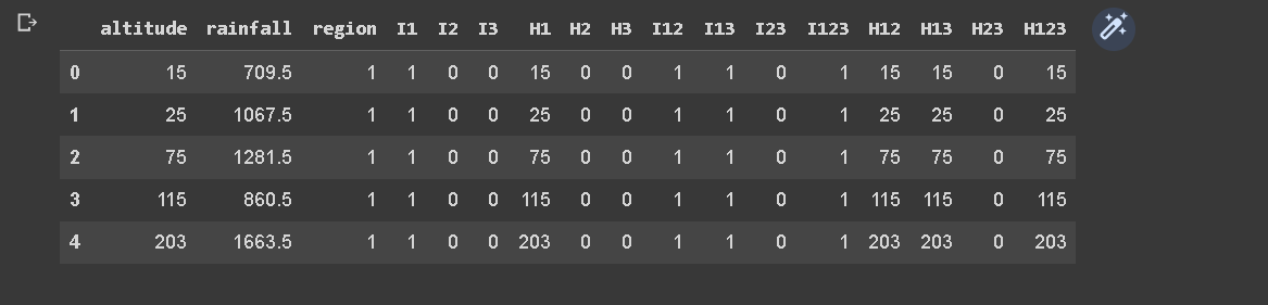 Similarly, new altitude columns H12, H13, H23, and H123 are created by multiplying the altitude column with the respective combination indicator variables. These columns enable the representation of altitude values for specific region combinations.