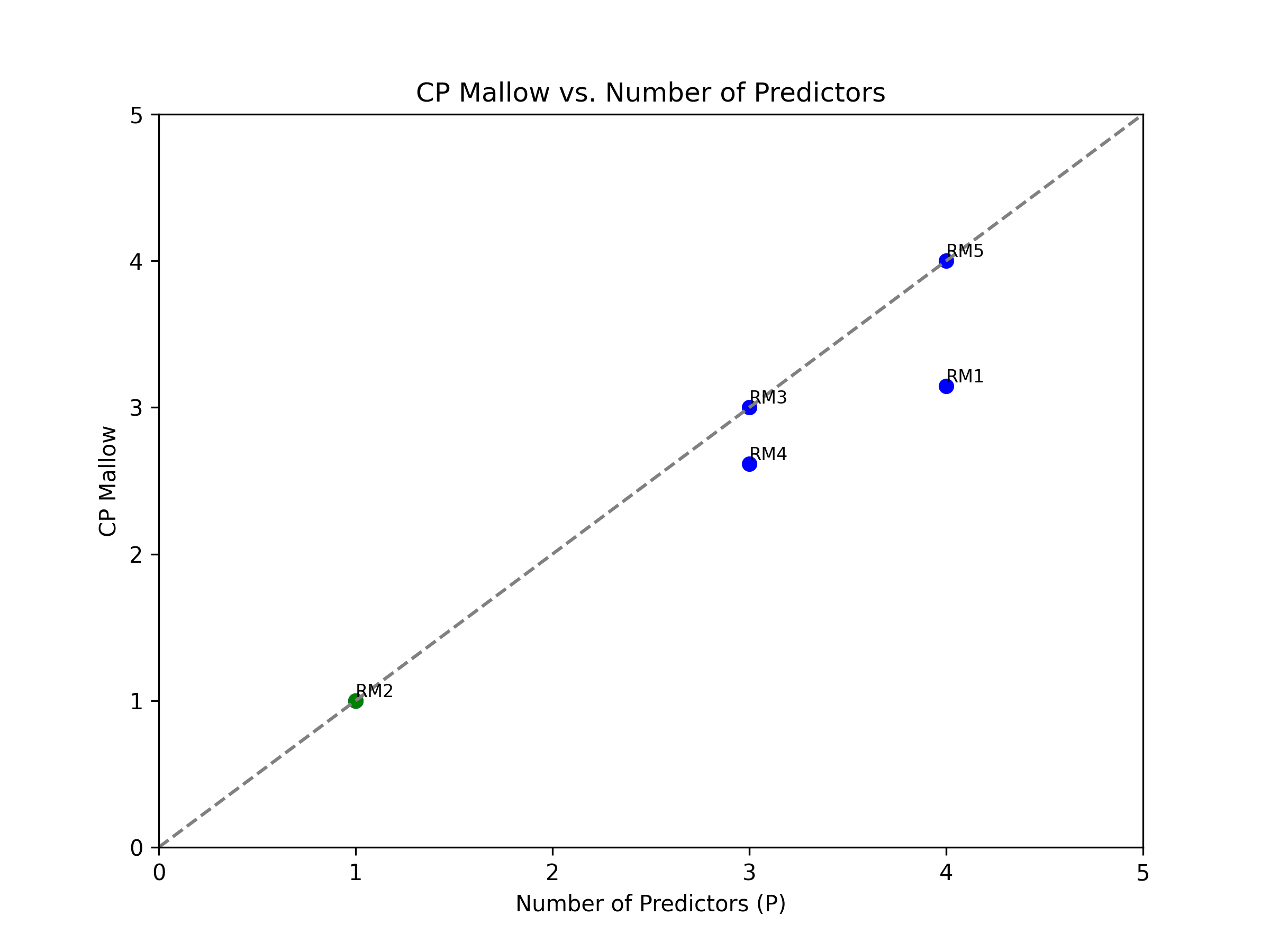 Next, we will plot the CP values on the y-axis corresponding to the respective number of predictors (P) on the x-axis. Each point on the plot will represent a reduced model, with the CP value indicating its performance compared to the full model.
