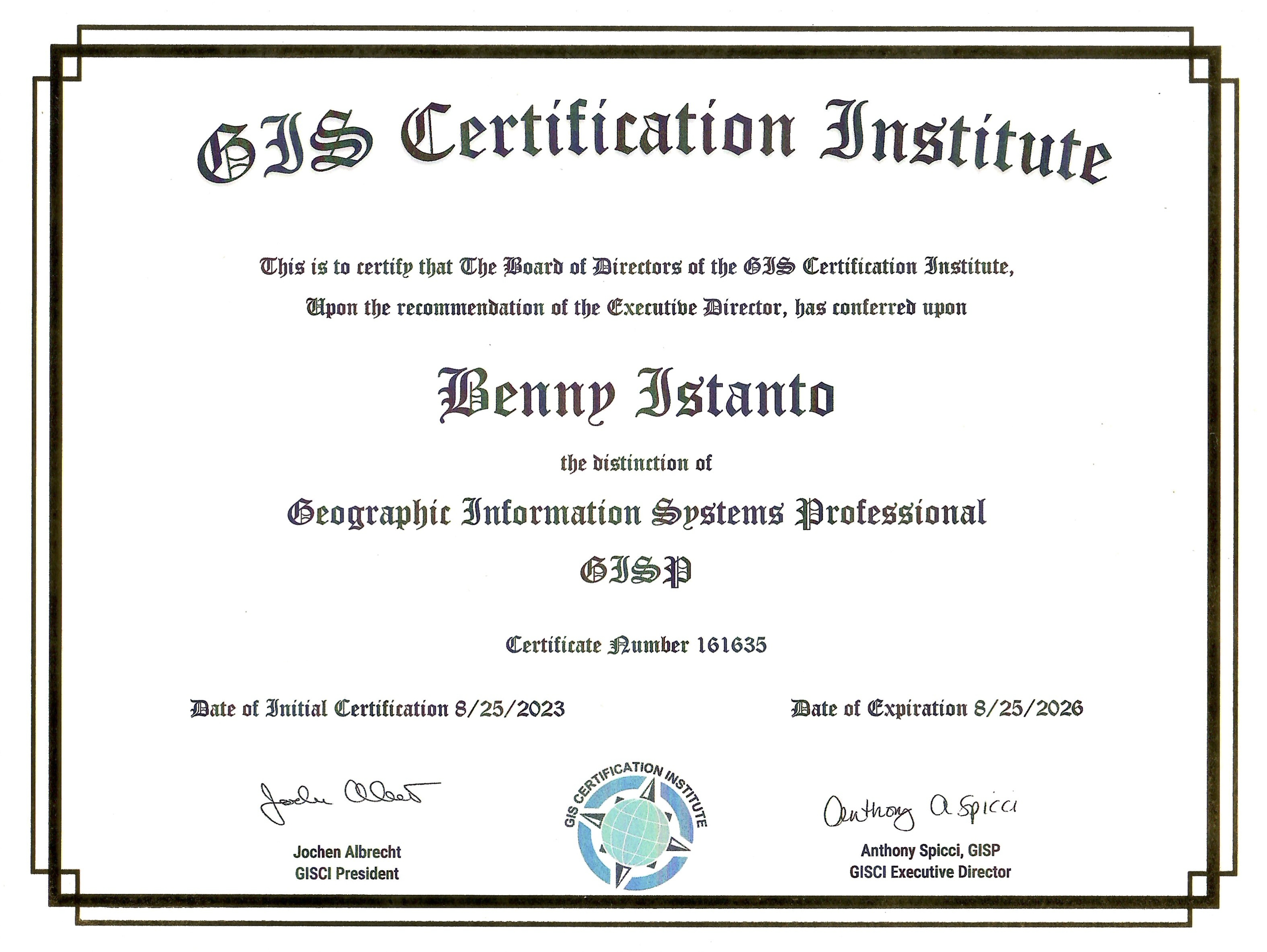 Big thanks to GIS Certification Institute (GISCI) for this recognition. To learn more about the GISP certification process, visit https://www.gisci.org