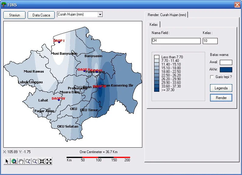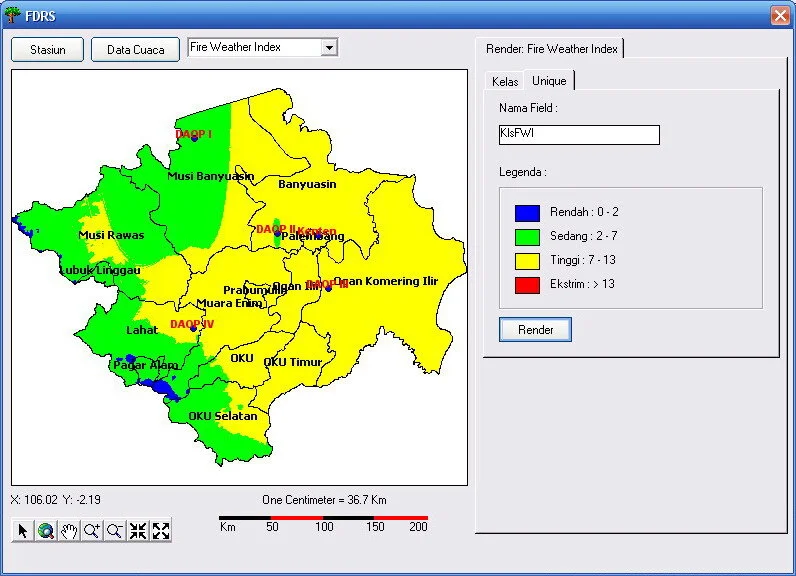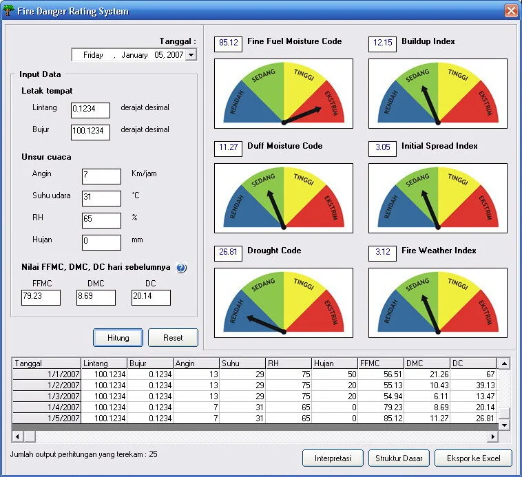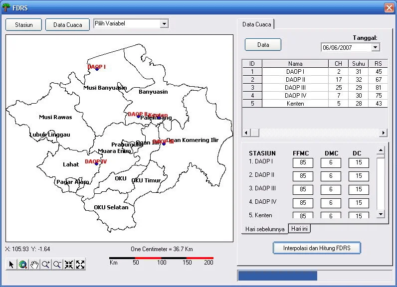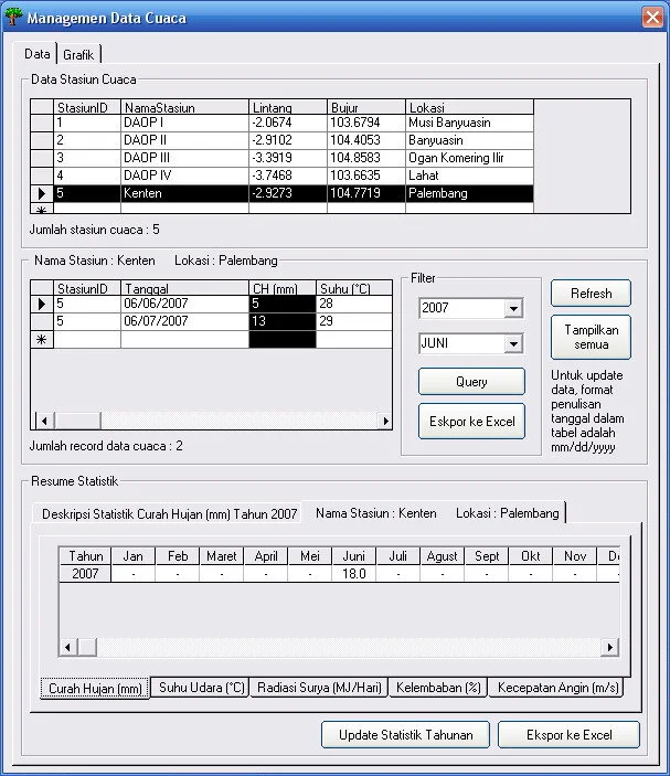 Comprehensive management of meteorological data (rainfall, air temperature, relative humidity, wind speed and direction) from multiple sources including BMKG, Manggala Agni, and plantation company weather stations. Features include simple queries, statistical information, and export functionality to Microsoft Excel.